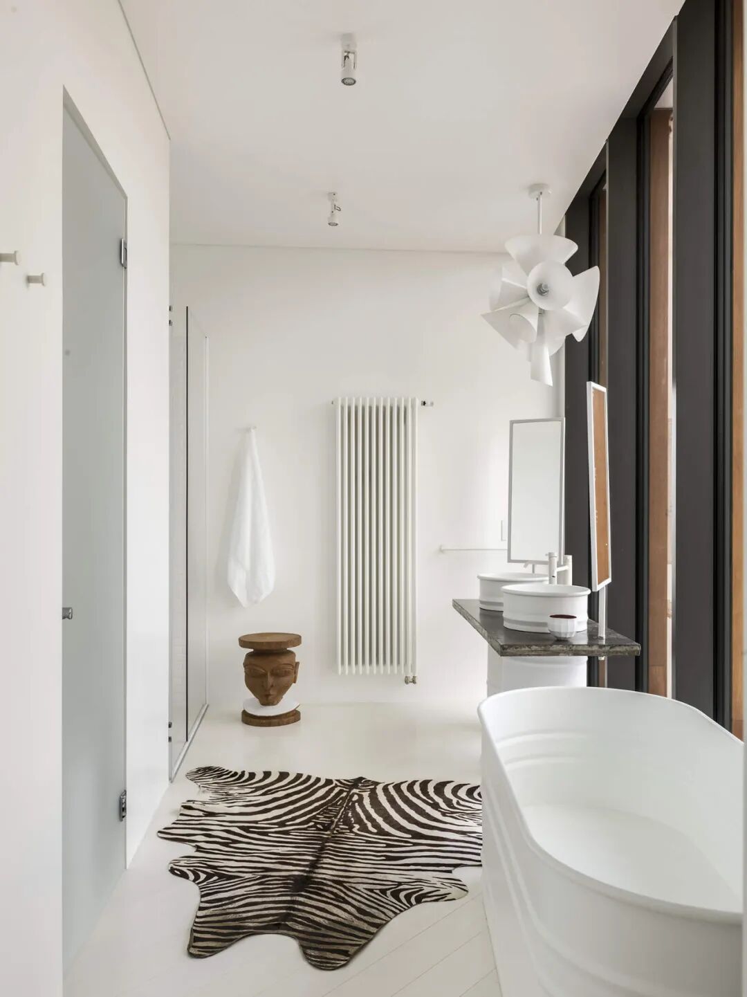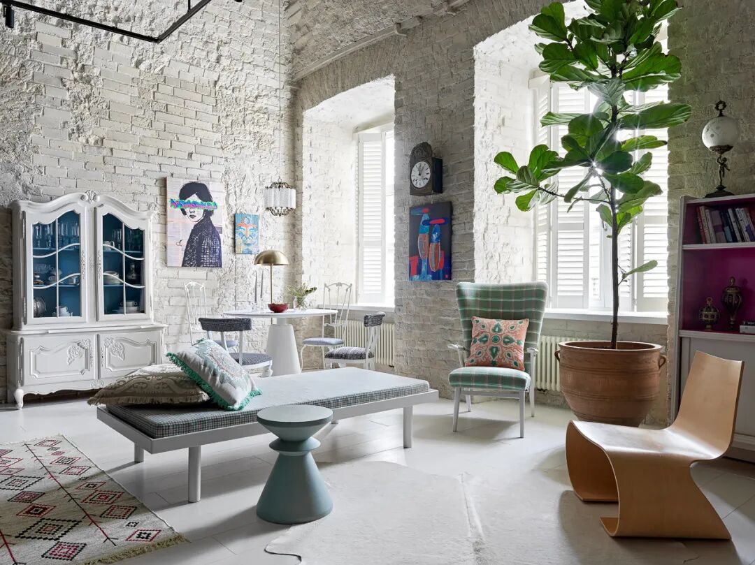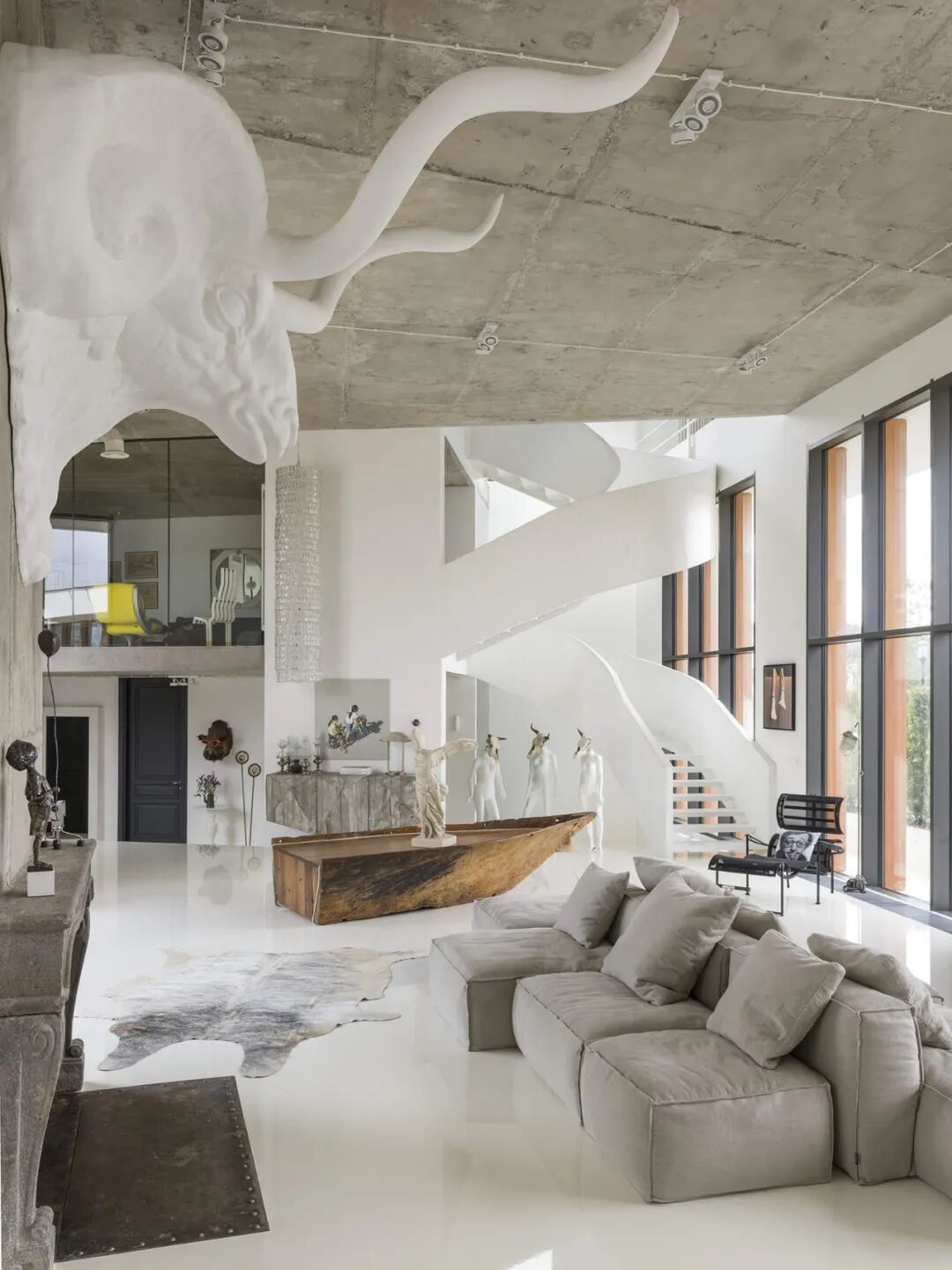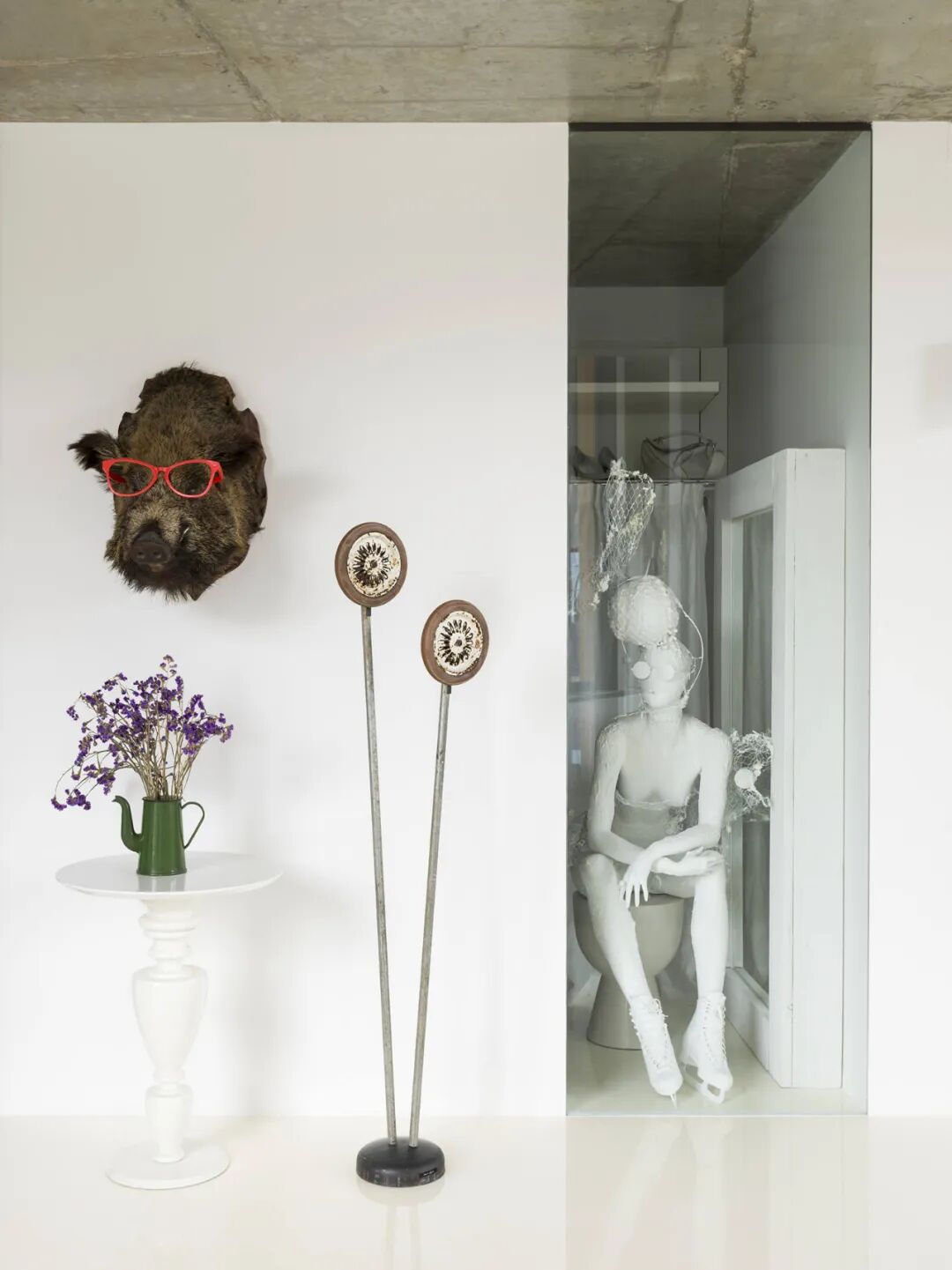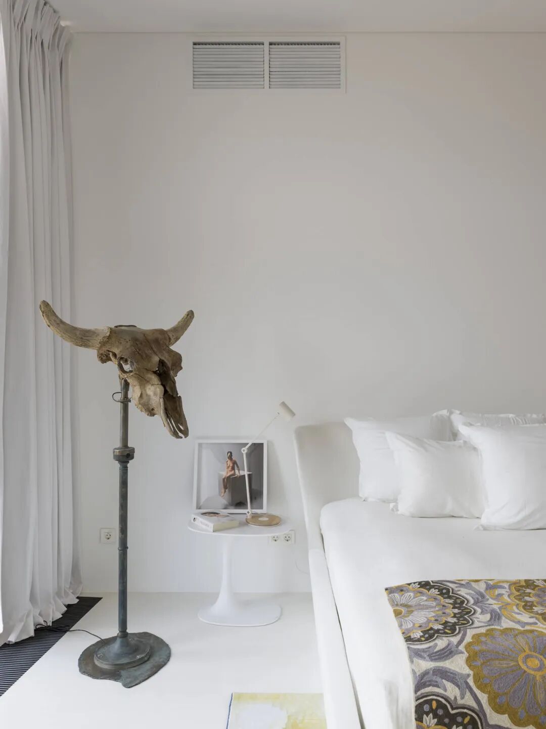 “人体模型和家中的许多雕塑足以达到我们想要的艺术效果,不必出现太多装饰,少即是多。”Erman说。巨大的羊头雕塑被安放在壁炉上方,古老的西方文化与现代艺术艺术的结合。“我真的很想看看老建筑是如何适应现代生活的。当有一个大空间时,将不同风格和主题的物体组合起来并不困难。主要的是要考虑到比例。如果房子很大,那么项目可能会很大。当然,我们正在考虑颜色组合。在这种情况下,由于空间是白色的,我们可以加上鲜艳的颜色。”
