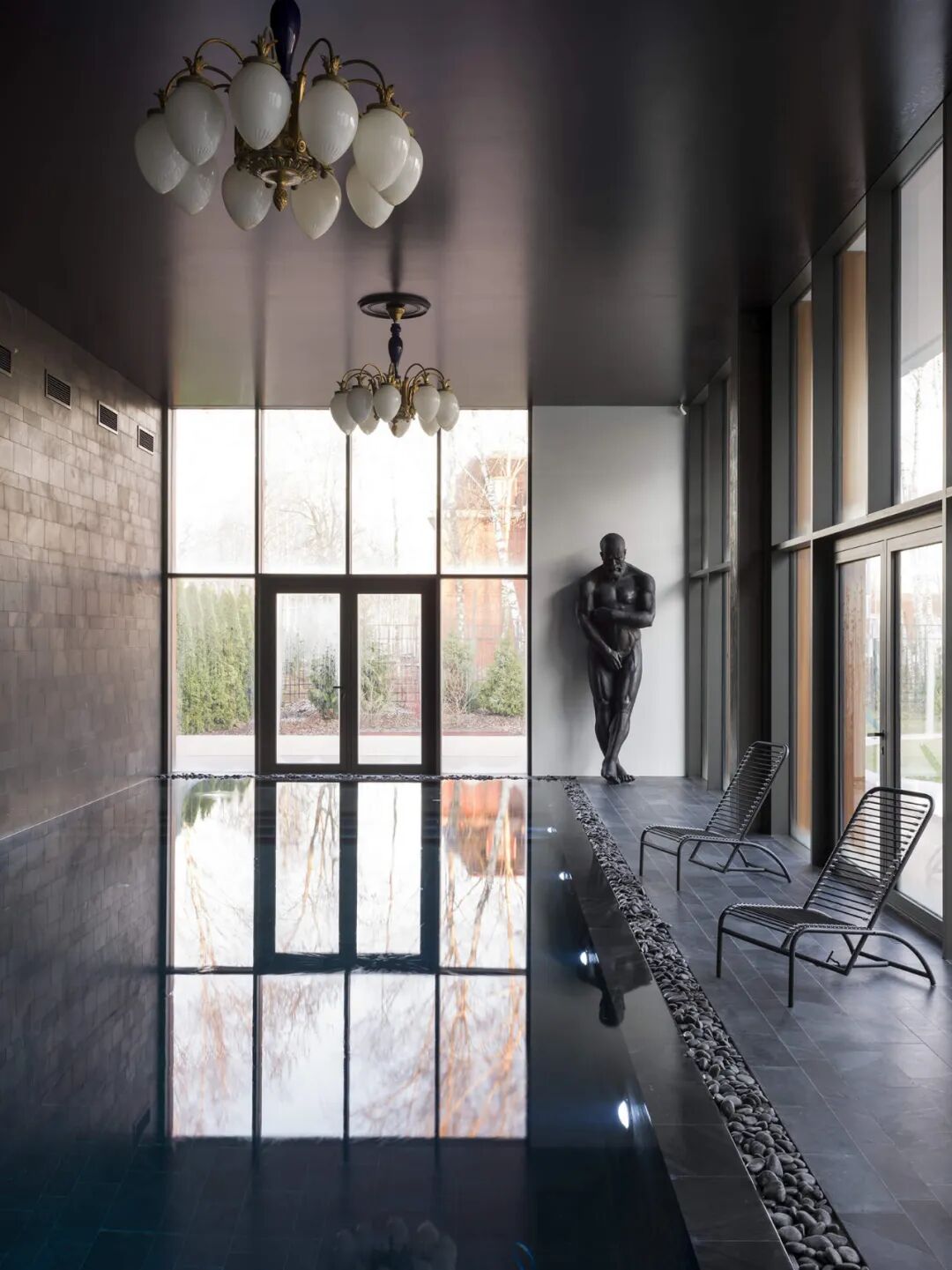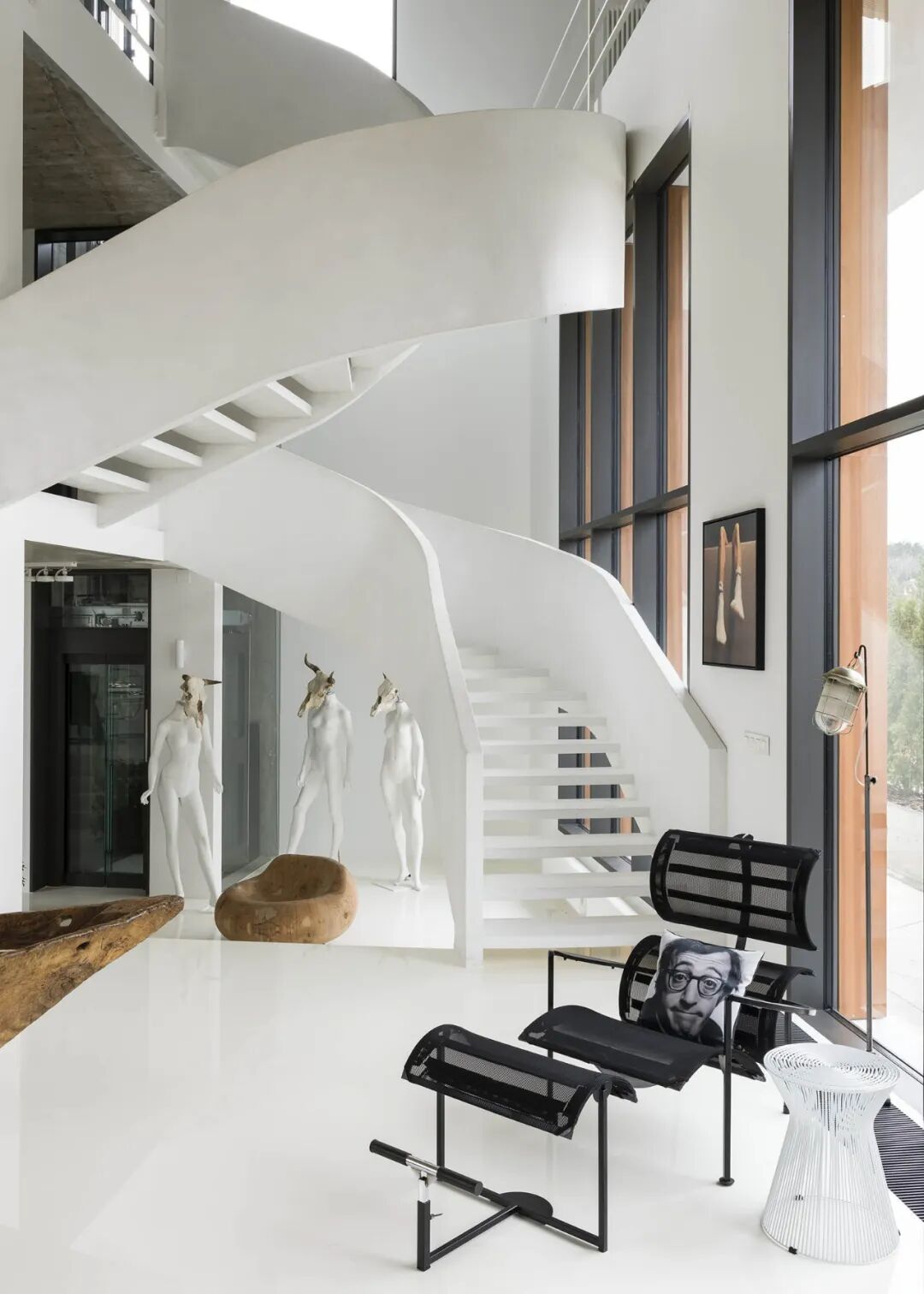 这座位于俄罗斯首都的两层房子让人想起了一座艺术画廊,展示了受自然启发的奇特图案的奇特运用。屋主邀请建筑师Olga Aleksakova和Yulia Burdova建造了这处房屋,由Anna Erman进行室内设计。屋主收藏了很多画作,他的梦想是把这间房子变成画廊,但Erman想继续强调建筑及装置的存在性。建筑呈半圆形,外部被庭院环绕,房屋共有两层,共10000平方英尺,一楼的公共区域为双高层,夹层楼设有办公室,外侧是游泳池;二楼为私人区域,有主卧、客房和儿童房,每个房间都有自己的浴室和更衣室。
