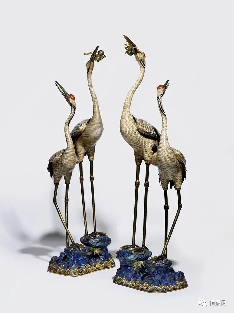 观这对仙鹤,收藏界中人自然会想起2010年的香港佳士得秋拍。这间龙头拍行当年举办「鹤鸣九皋」专场,带来数件英伦放山居(Fonthill House)珍藏古玩,包括一对御制掐丝珐琅双鹤香炉,由富商「大刘」刘銮雄以逾HK$1.29亿天价投得,据悉是作寿礼之用送给母亲。