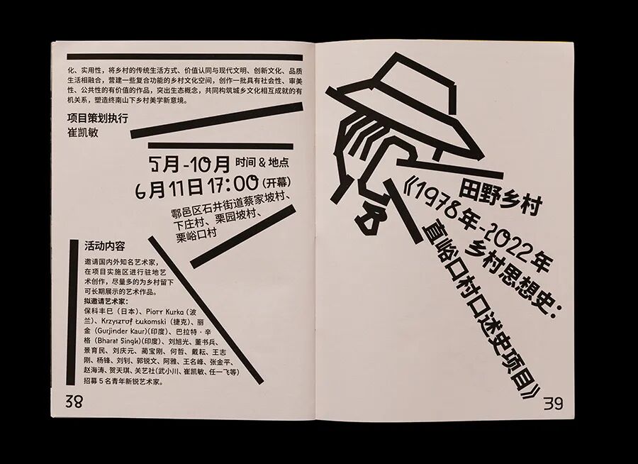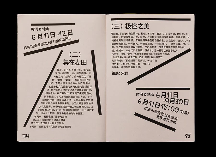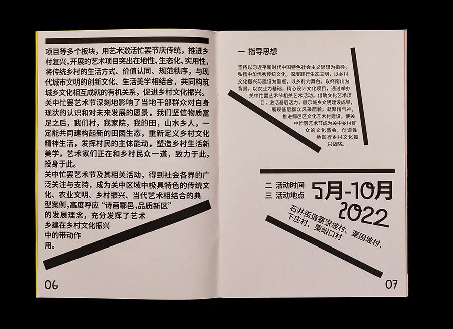 关中忙罢艺术节位于陕西省西安市户县,以“忙罢”时节为契机,将乡土田野化为创作空间,试图引入艺术来激活并展示其地域文化魅力。基于关中地区的语言特色,我们借用“声音”为切入点,以“发声”作为视觉概念的核心,承“呼朋唤友”之意,通过采集收录当地村民的声音,将关中腔调贯穿于整套形象系统之中,文本信息亦以一种粗拙的字形设计及独特的文字编排方式在画面中搭配呈现。我们希望伴随着每一句流动的声响,能让观众感受到关中乡土文化的鲜活与艺术创作的在地性。