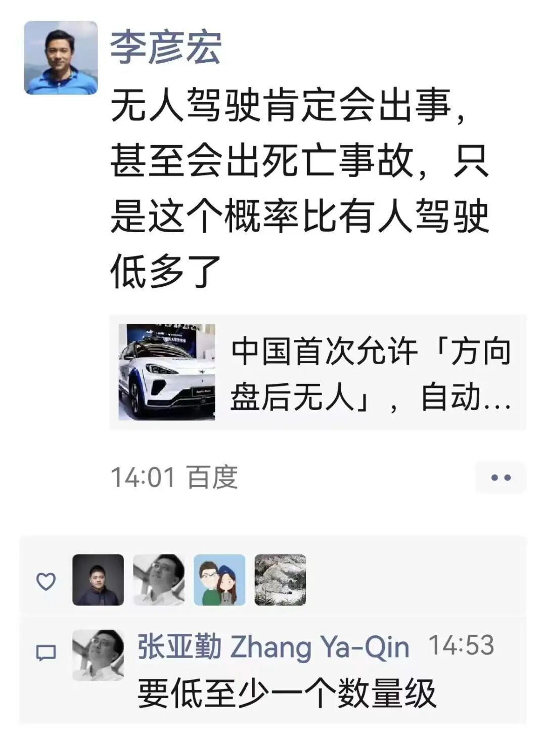 就在百度拿到无人化示范应用许可的第二天,百度创始人、董事长兼CEO李彦宏发了一条朋友圈:“无人驾驶肯定会出事,甚至会出死亡事故,只是这个概率比有人驾驶低多了。”