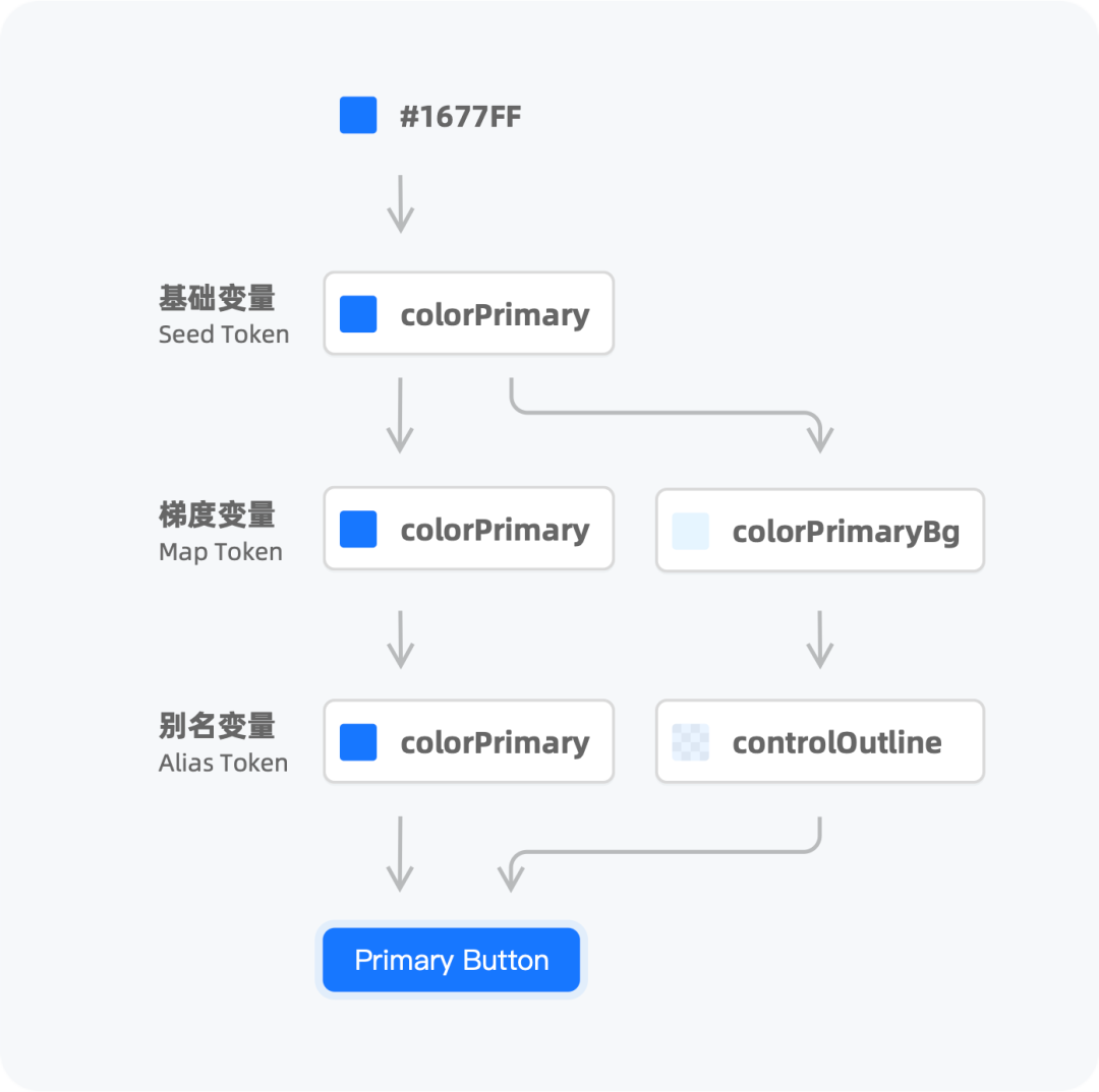 过去尝试通过 CSS Variables 提供动态主题能力。在经过一段时间的探索后,发现随着设计系统的复杂度提升,其中间变量的维护成本就会变得不可忽略。因而在 v4 时期,CSS Variables 停留在了动态主题色而没有进一步提供暗色、其他 Token 的动态能力。到了 v5,随着灵活性的需求呼之欲出,不得不再次面对动态主题的问题。