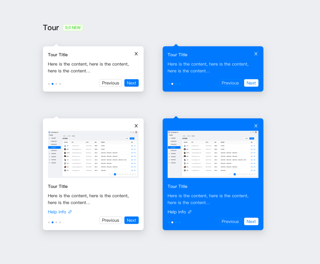 另外在默认样式方面,对组件进行全面升级。秉持快乐工作的内核,从「更聚焦」、「去干扰」、「轻松感」三个方向对系统视觉进行了升级。其中涉及到主色、圆角、文字色阶、交互反馈等多个全局样式的优化和调整,另外对导航框架和几乎所有组件做了去线化处理。这些改变,除了能带给你焕然一新的感觉,在具体使用过程中,也更加易用。当然,如果对样式主题有不一样的审美和诉求,在 5.0 当中,可以轻易根据提供的样式算法和配置工具,一键定制属于你自己的主题。