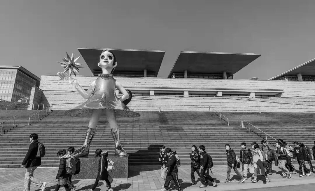 这条长道引导着大家绕到了美术馆的南侧,也就是临海的一侧。这个方向才终于看清楚美术馆是由三座平行长方体玻璃建筑和一个巨大的石壁基座组成。台阶下还有一个巨大的女孩雕像。