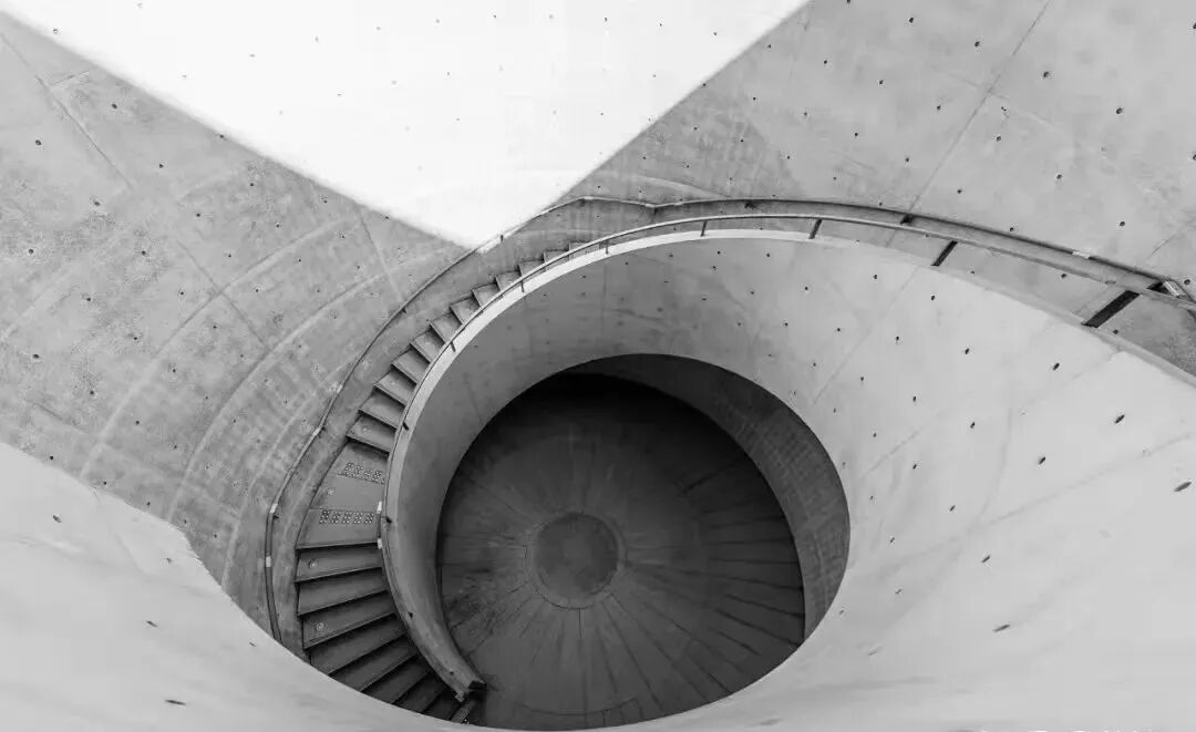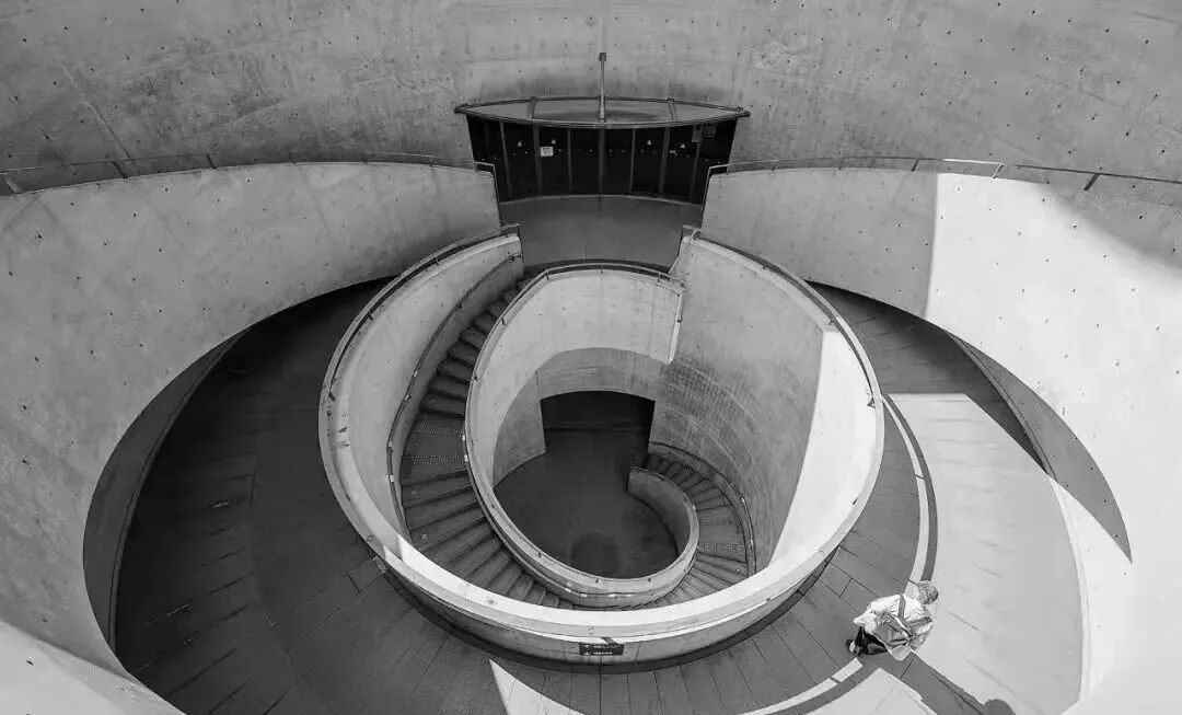 两座玻璃箱体中间,设置了一个巨大的内向螺旋楼梯,造型别致。从这里可以连接上下楼层,这里可以进入下面的主厅入口。
