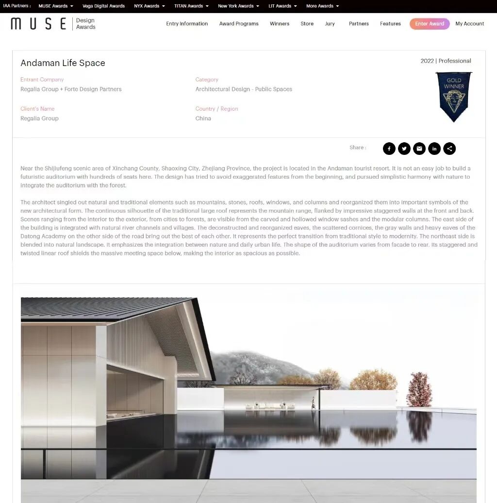 MUSE Design Awards(缪斯设计奖)是全球创意设计领域颇具影响力的国际奖项之一,创办于美国纽约,由历史悠久的国际奖项协会International Awards Associates(IAA)主办,作为极具影响力的国际奖项,缪斯设计奖以严格的评审体系以及高质量的评判标准著称,旨在发掘和表彰建筑、室内、时尚等设计领域的杰出者。