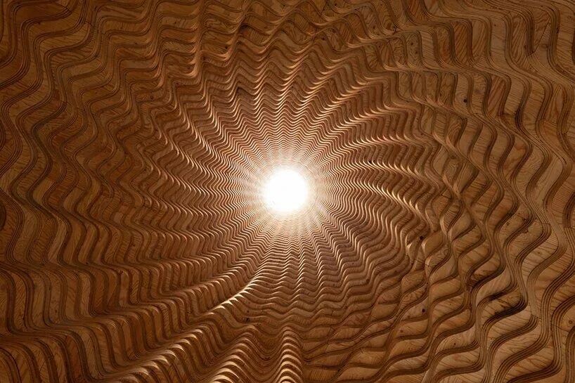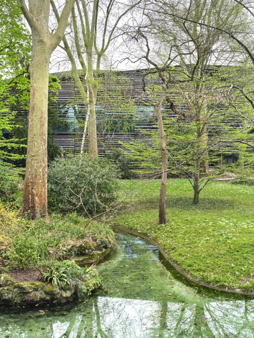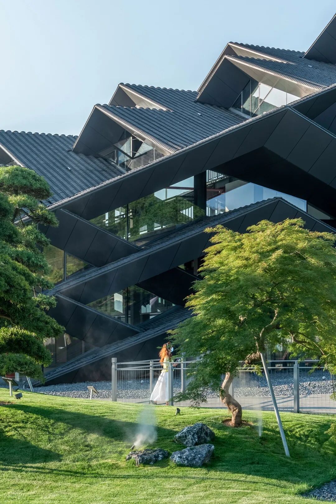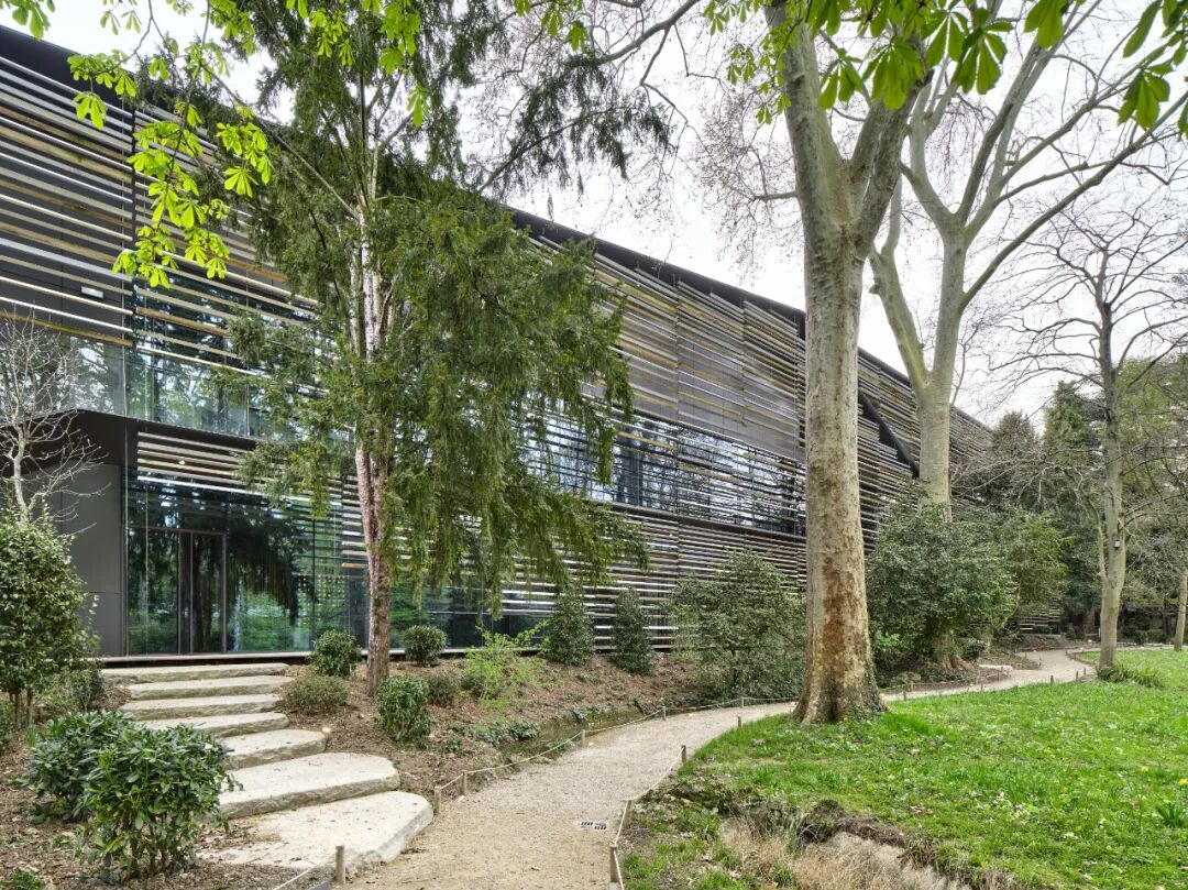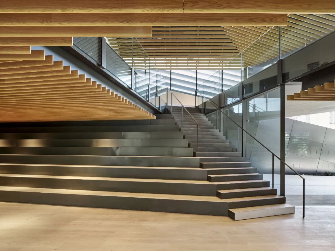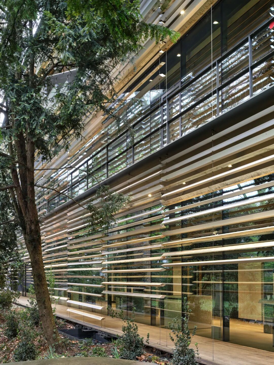 面向城市的围护主要由铝制成,花园一侧则主要由木材制成,两种材料时而以渐变形式混合,与自然环境和谐相融,营造一种朦胧美与私密感。