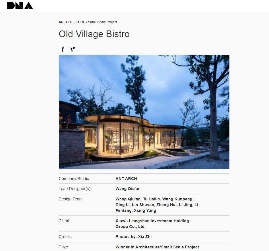 2022年法国巴黎DNA设计大奖共征集来自全球范围内参评的上千份作品,经过评审团的层层选拔北京安哲建筑设计主创王求安凭借『老村小馆』项目荣获建筑组/小型建筑类别大奖WINNER!