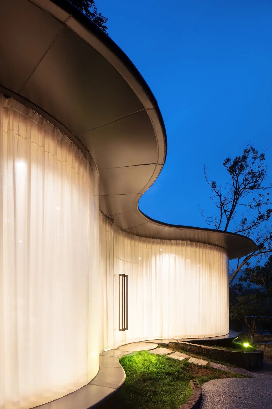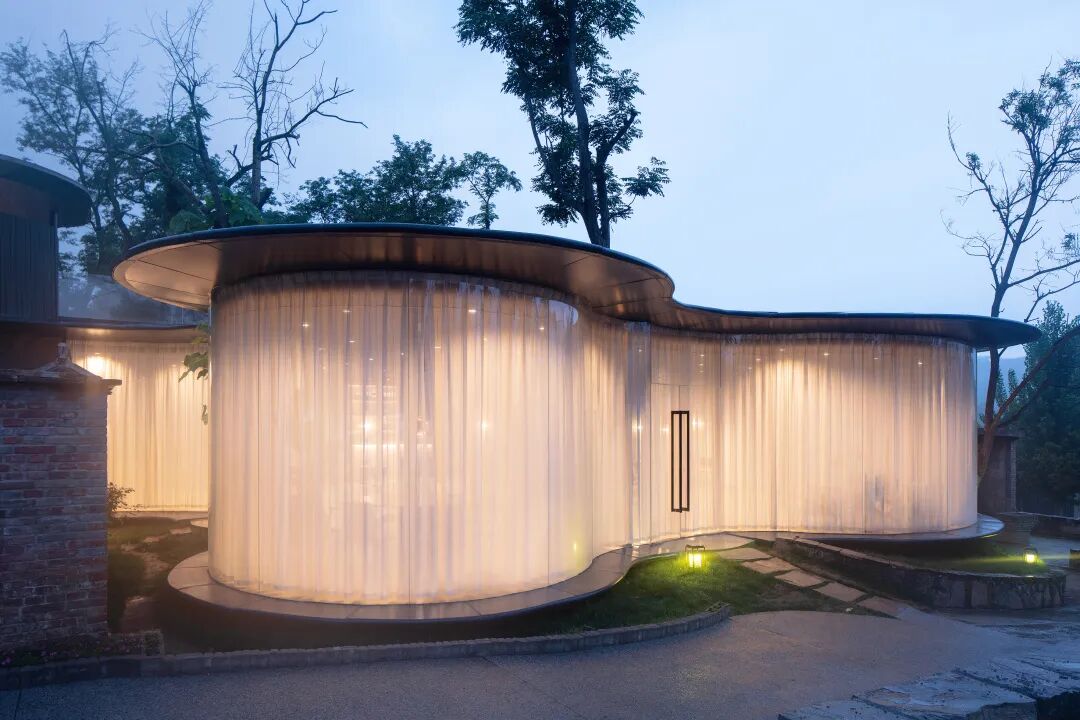 弧形玻璃和素土建筑等设计语言,营造屋檐下、棚有台、土山房等多个建筑空间。小馆是集餐厅、清吧、小舞台、民宿、中式庭院、艺术展墙一体的多功能空间。同时满足不同场景,游客们的多重需求。