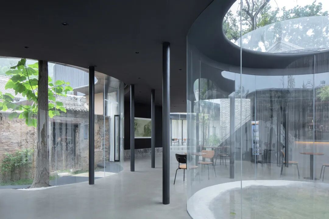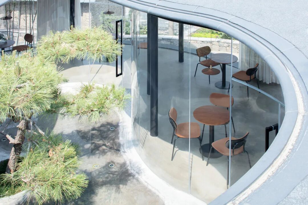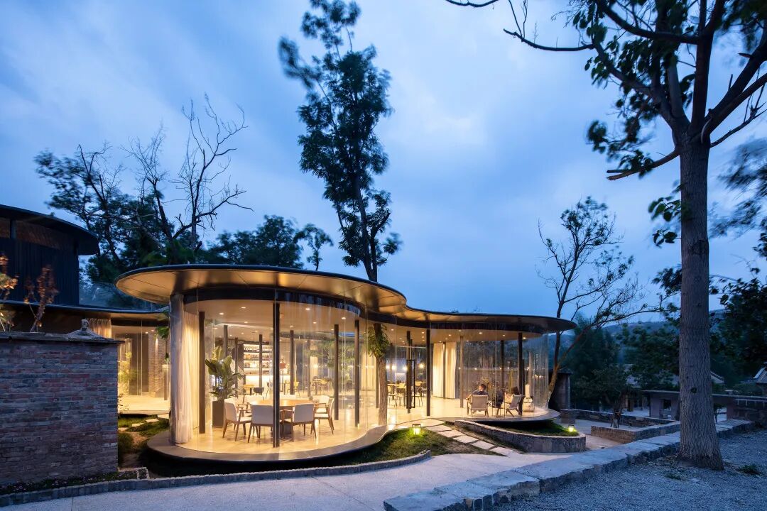 「老村小馆」的设计秉承延续乡村建筑特色,保留建筑肌理的原则,老屋内的十二棵古树被完整地保存下来,曲线的玻璃边界和葫芦形的天井,都是为了绕开现状树木而产生的自然形态。