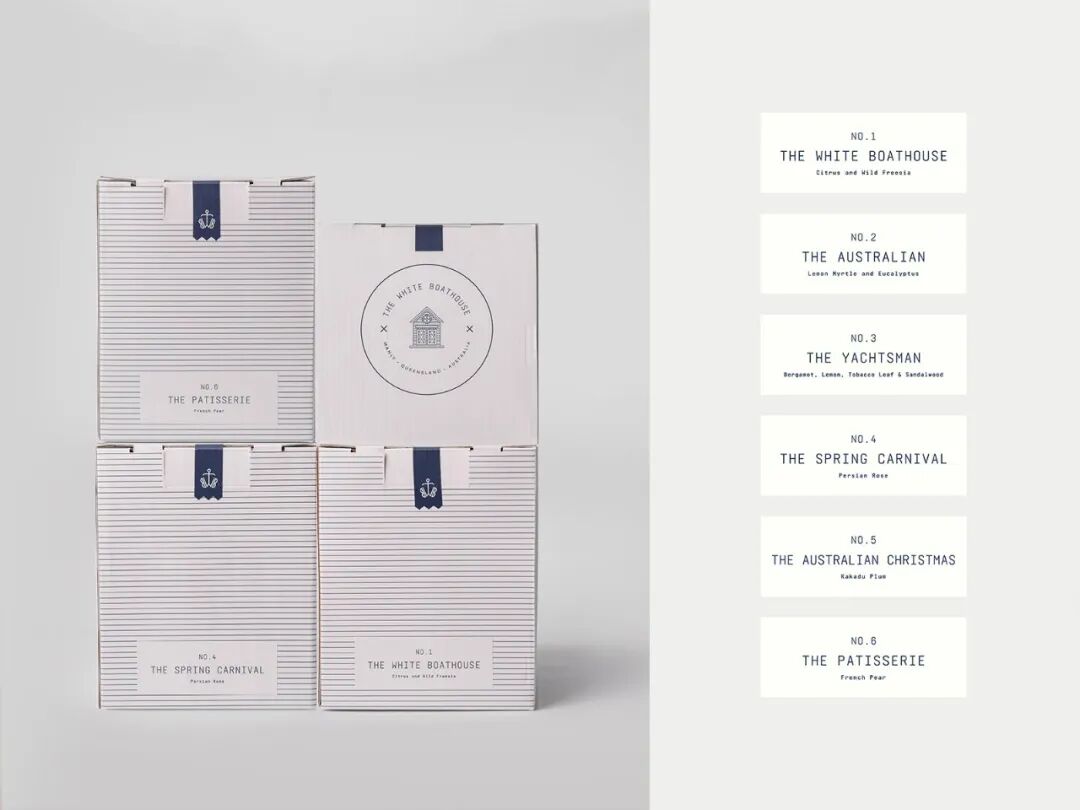 项目被委托创建一个简约的品牌形象,吸引眼球,并为产品系列包装,其产品范围包括 6 支手工吹制容器中的蜡烛、用于鸡尾酒的大透明玻璃罐中的干酸橙和柠檬,以及室内喷雾。Ceren创造了一个结合简洁设计和航海主题的形象。标志和包装设计的灵感来自海岸边的一排小船屋,使品牌识别具有沿海和微风的外观。我们在包装和包装纸设计上使用了所有5个船屋的插图。