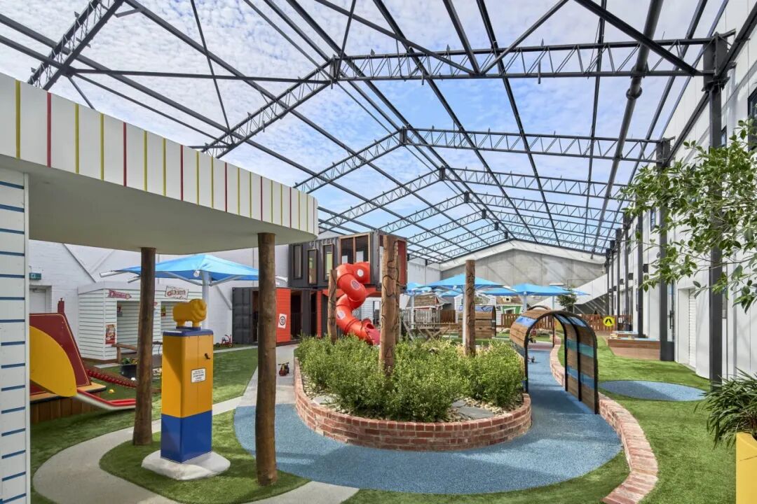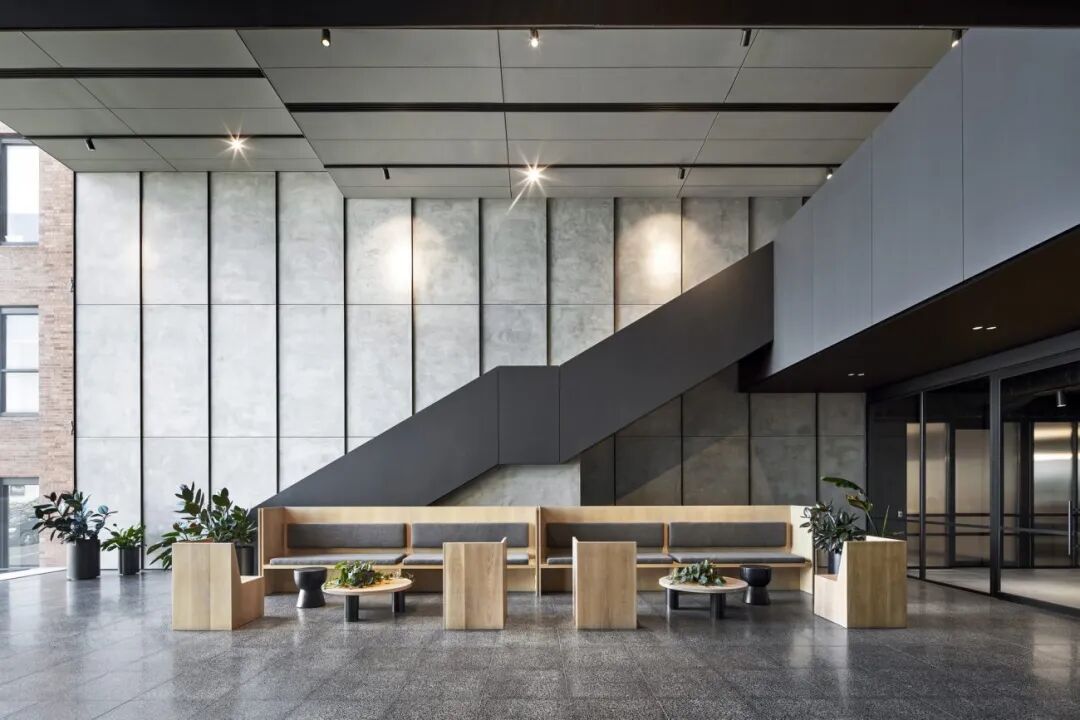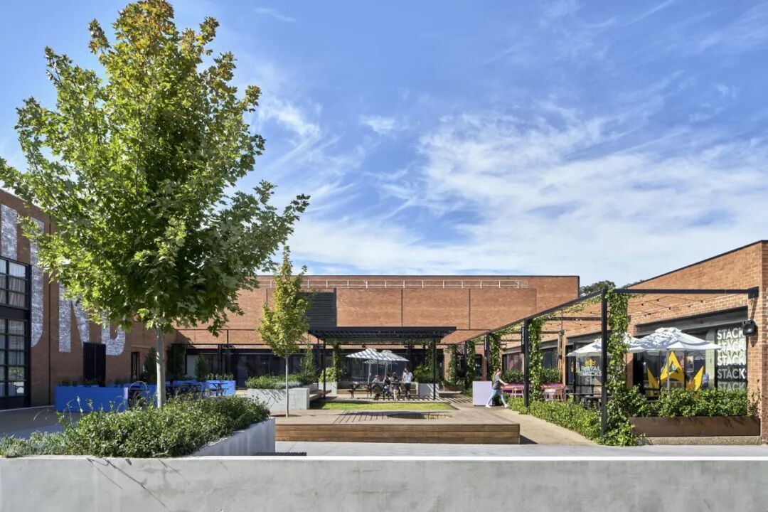 Considered contemporary incisions and insertions were made to repurpose the buildings for their new uses, with Genton employing black steel, polished and restored concrete, and recycled brick throughout to cohesively unite warehouse buildings of differing Architectural eras in a consistent design language. Lush native plantings are abundant throughout the six hectare site, nourished by rainwater re-use. Softening the industrial structures, the landscaping and plantings complement the vast scale of the built form and red brick façades.