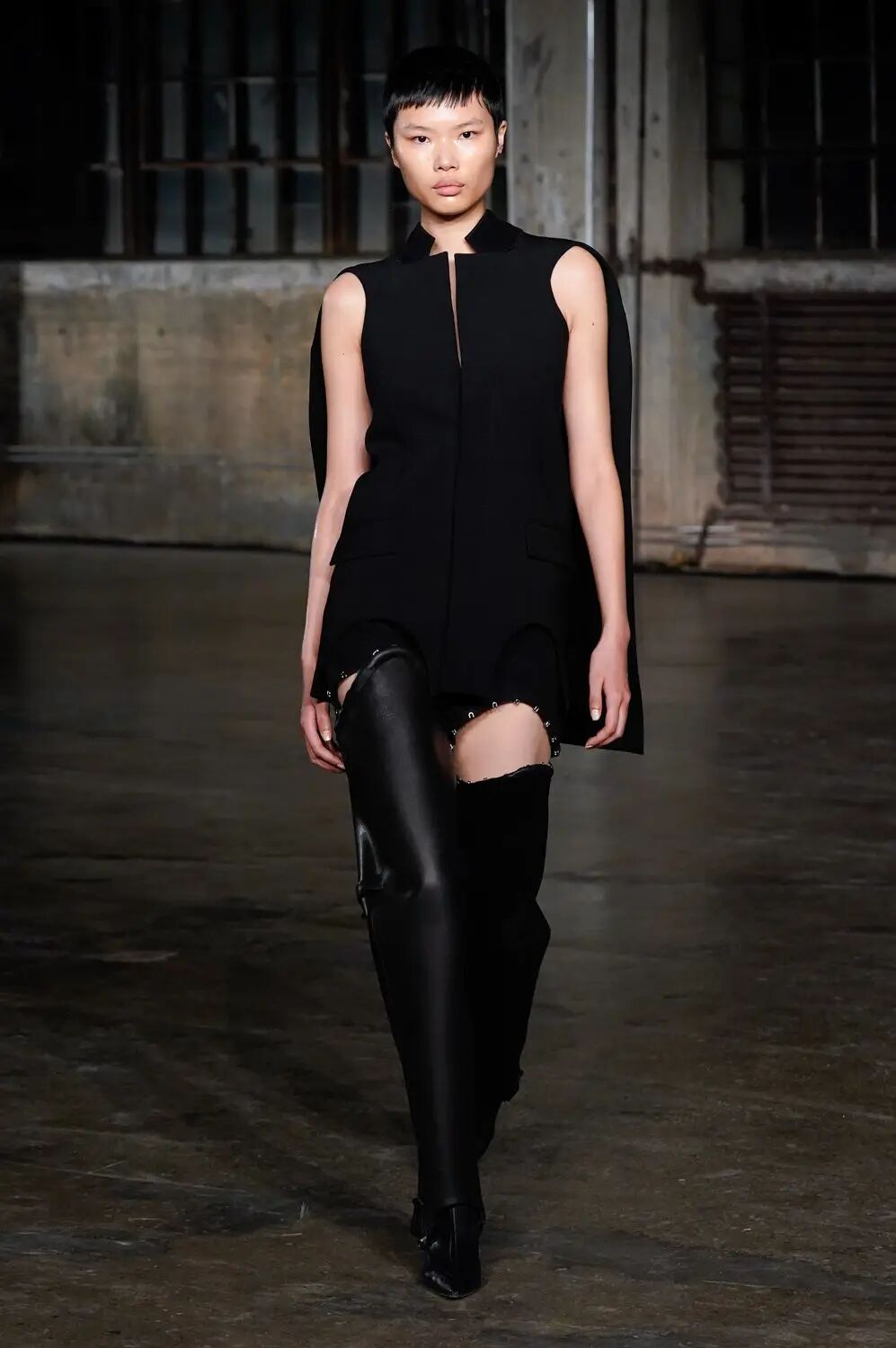 Dion Lee继续将自己擅长的解构手法运用地淋漓尽致,将设计重点放置在服装结构上,并把建筑中的模块化设计融入到服装中,将实验性建筑与传统剪裁相融合,让系列作品散发出具有颠覆性的性吸引力。