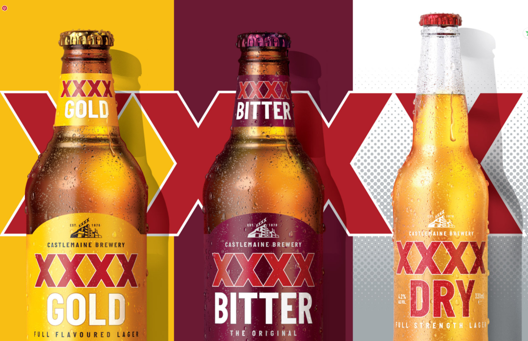 四个X的LOGO,一个知名啤酒品牌由Landor & Fitch在澳大利亚的工作室,操刀重新设计了品牌和包装视觉,将四个X直接拿了出来,其他一概不要你叉叉叉叉,真的很骚气,超强的视觉符号看这色彩看这配图,太绝了