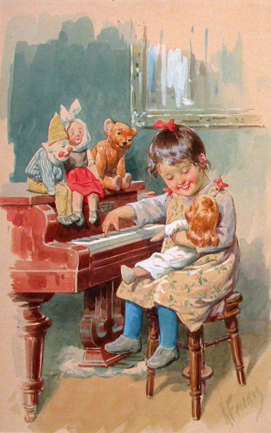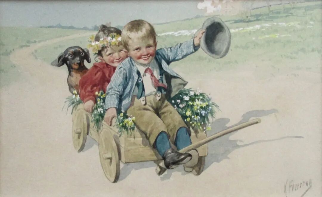 他的艺术家明信片以儿童、动物、木偶和泰迪熊为主题,销量很大。