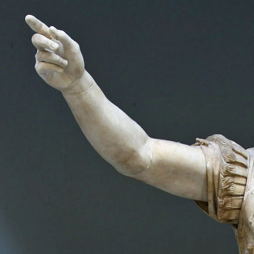 持矛者变成了奥古斯都屋大维,古典结构罗马化,波利克利特斯的理想化不可避免地被赋予一种真实的庄严神态。这是罗马人的折衷方式,也是罗马艺术成就的真正特性。
