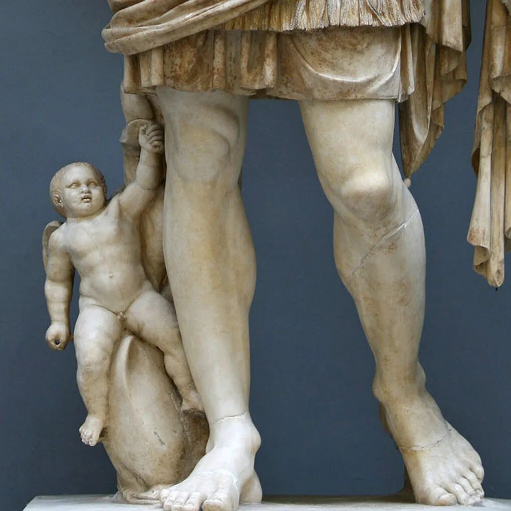 屋大维高举右臂成为指挥姿势,他通过凝视和手势,以他个人的力量支配着他面前的整个空间。在他的右脚边,有一个小爱神丘比特的形象,表明他不仅是一个伟大的统帅,同时也是一位仁爱之君。