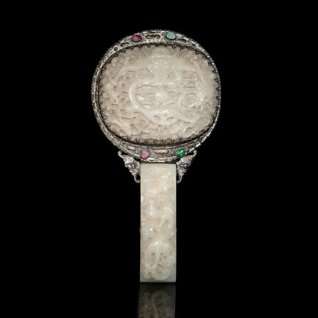 玉雕云龙纹瓦头及螭龙纹文带镶银执镜