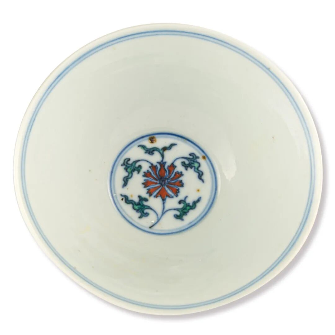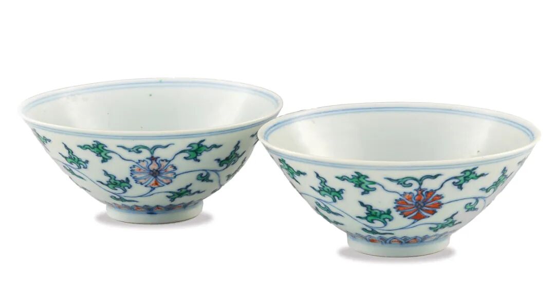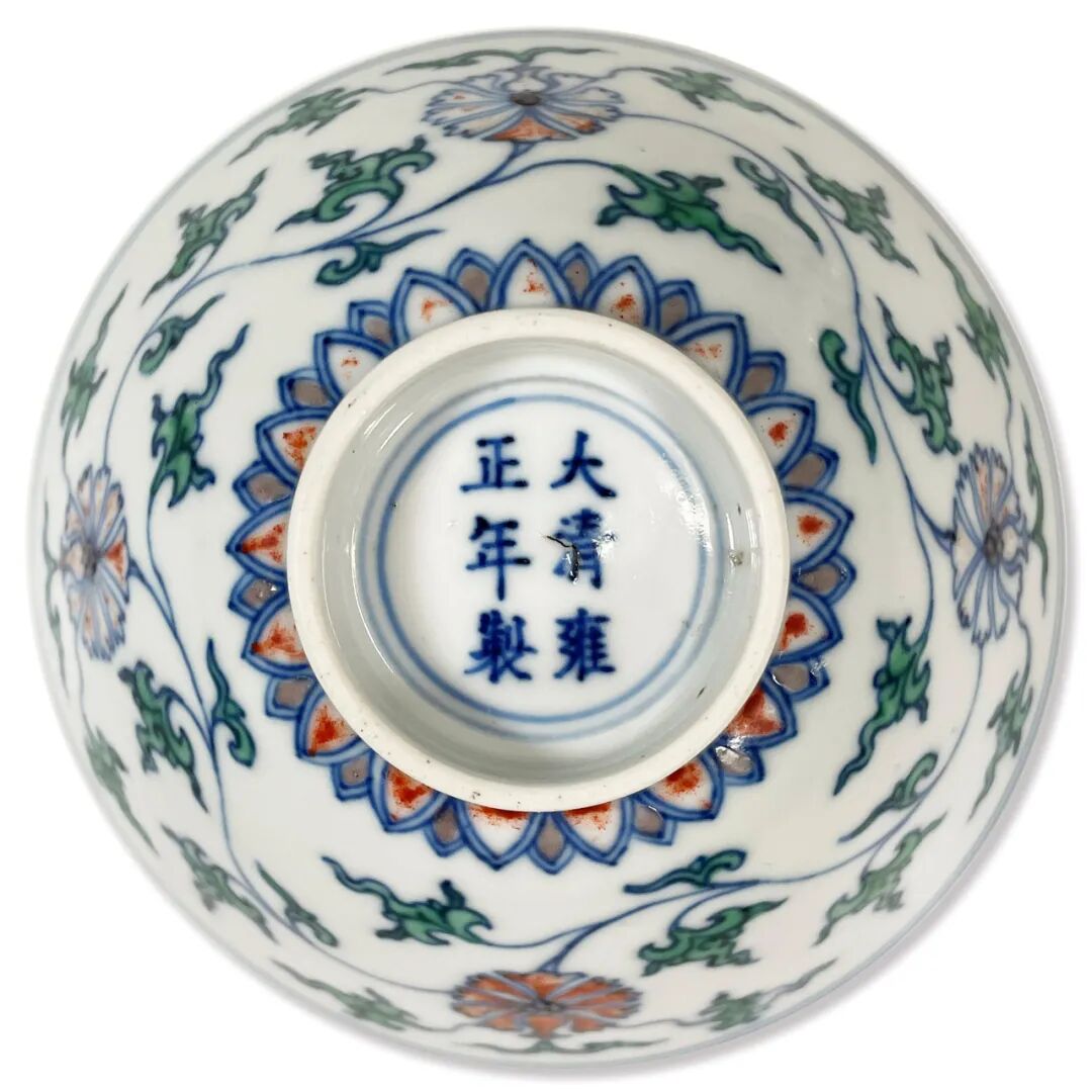 此对碗呈斗笠形,胎体轻薄,釉质莹润。外壁以斗彩绘缠枝莲纹,碗心青花双圈内也绘斗彩缠枝莲纹。以淡描青花勾勒轮廓,青花线条纤细流畅,填彩精准,以绿彩为主色调,红色点染花卉,整器造型精致,青花发色青翠淡雅,斗彩明艳夺目,给人以清雅隽秀的风韵。底心内书青花楷书「大清雍正年制」六字双圈款识。成对保存,更为难得。