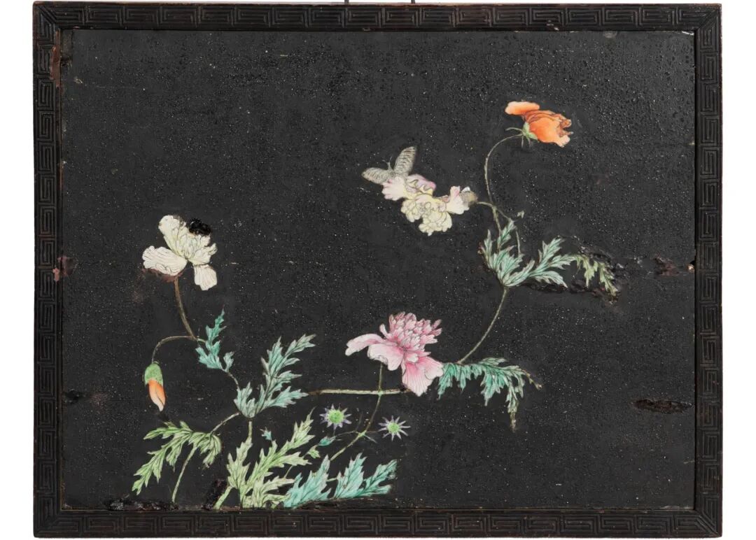 挂屏的框为黑色大漆工艺,框身满工描金缠枝花卉纹,画工精美细腻,并有原配铜鎏金斩花挂钩,挂屏整体富丽堂皇。