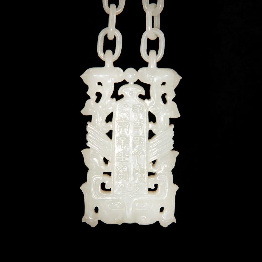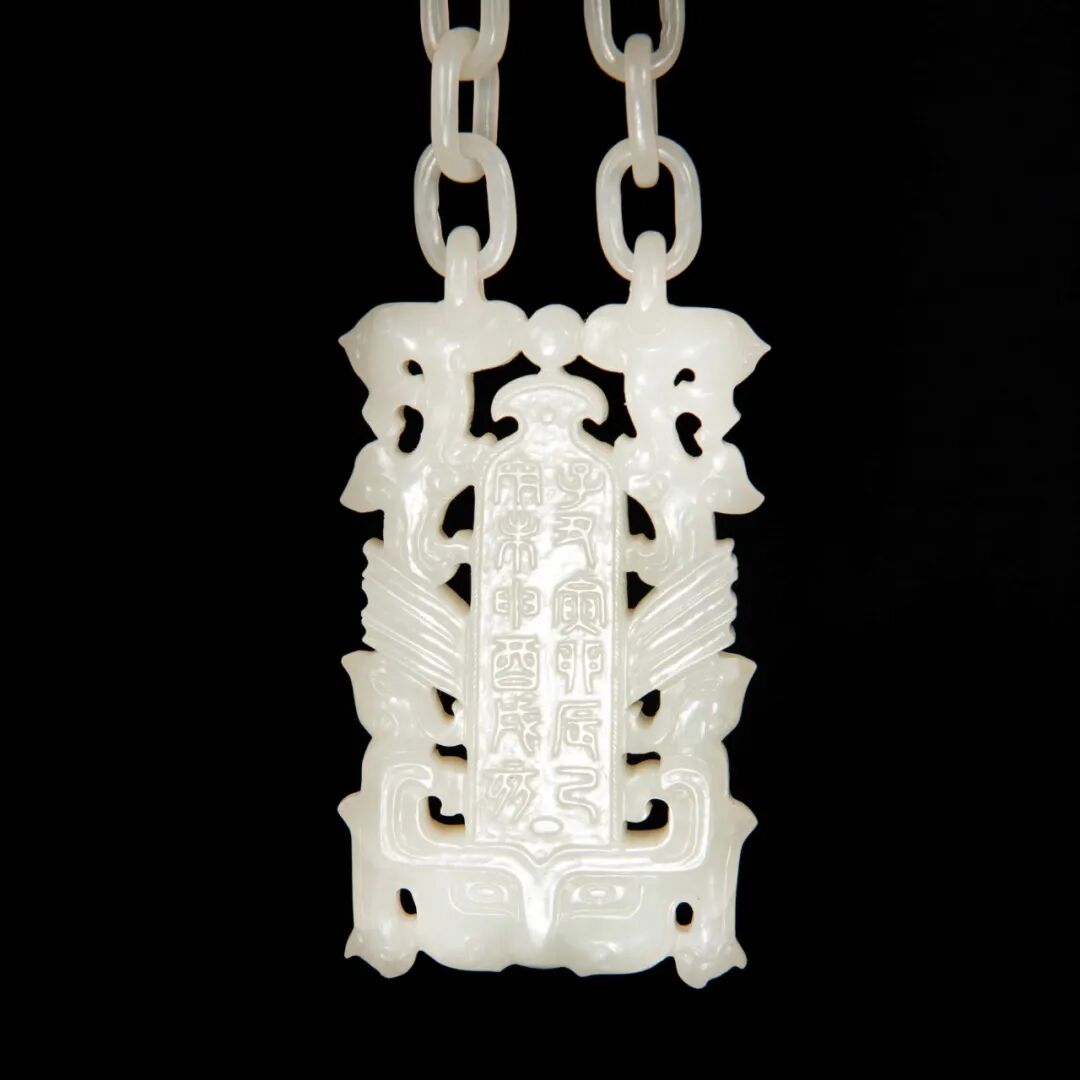 此件白玉合牌佩通体呈板片状,玉质晶莹润泽。双面雕琢,雕工细腻。玉佩上方两边雕有灵芝如意纹,下部琢以兽面纹,颇具古韵。玉佩链接玉环,环环相扣,系活链治玉技术。