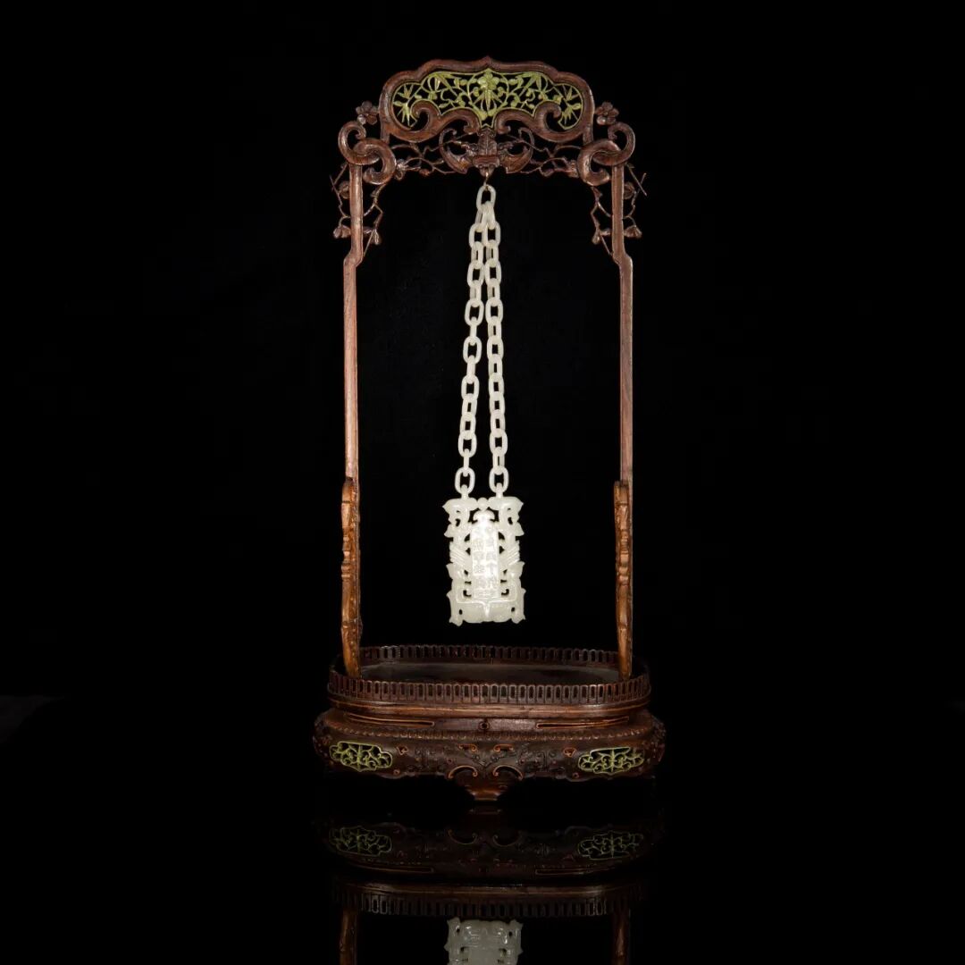 此件玉佩主体以「天干地支纹」的中国传统文化为题材,较为罕见,又结合活环链接工艺。本件玉佩配以骨、木雕梅竹纹木架,中间雕有蝙蝠,寓意「福在眼前」。整体造型精致,雕工精湛,是一件巧夺天工的珍品。