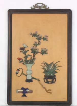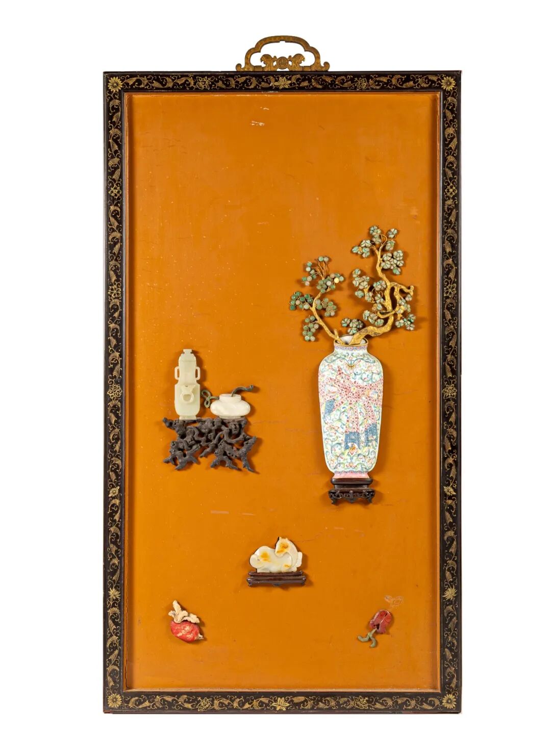 此件挂屏屏面以黄漆为地,左边饰以紫檀和白玉雕刻的双耳盖瓶和水盂,右边是粉彩瓷系带花瓶,瓶中插花卉。下方中间是白玉卧马配紫檀底座,左下角为雕刻的萝卜,右下角是玛瑙双鱼。屏面上的木雕底座,由树枝交错盘旋而成,工艺繁复。