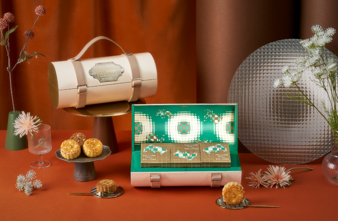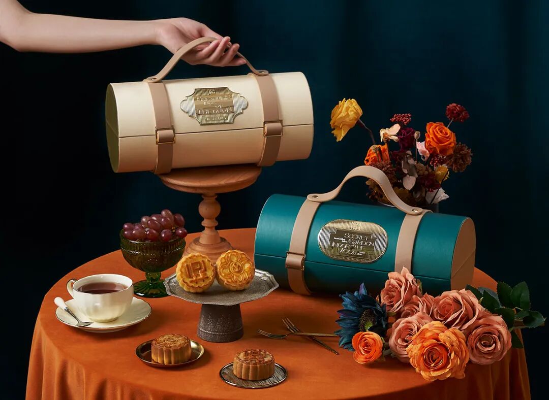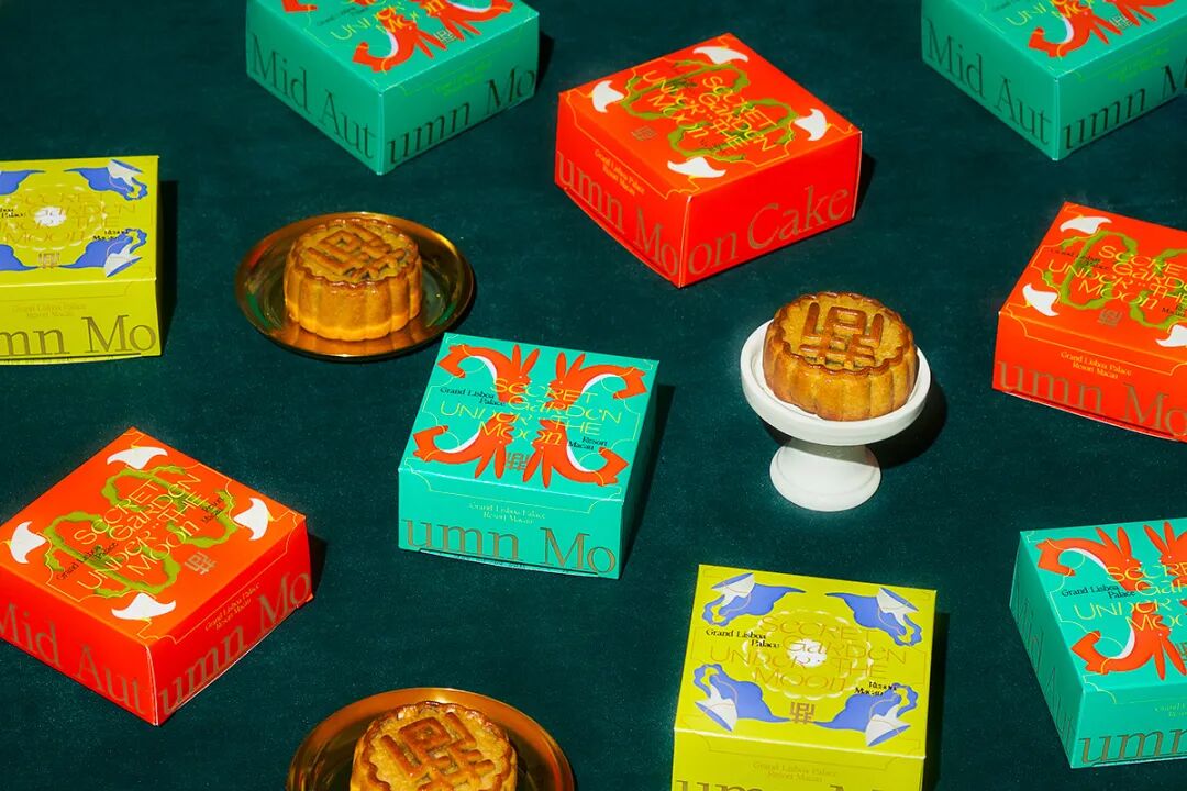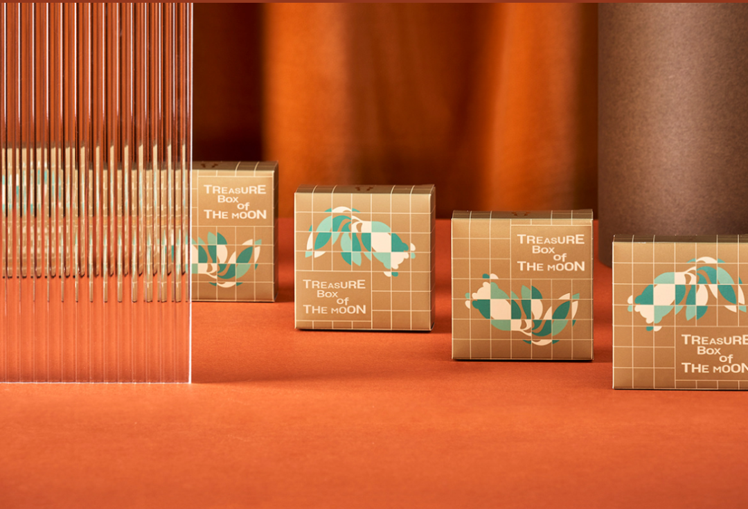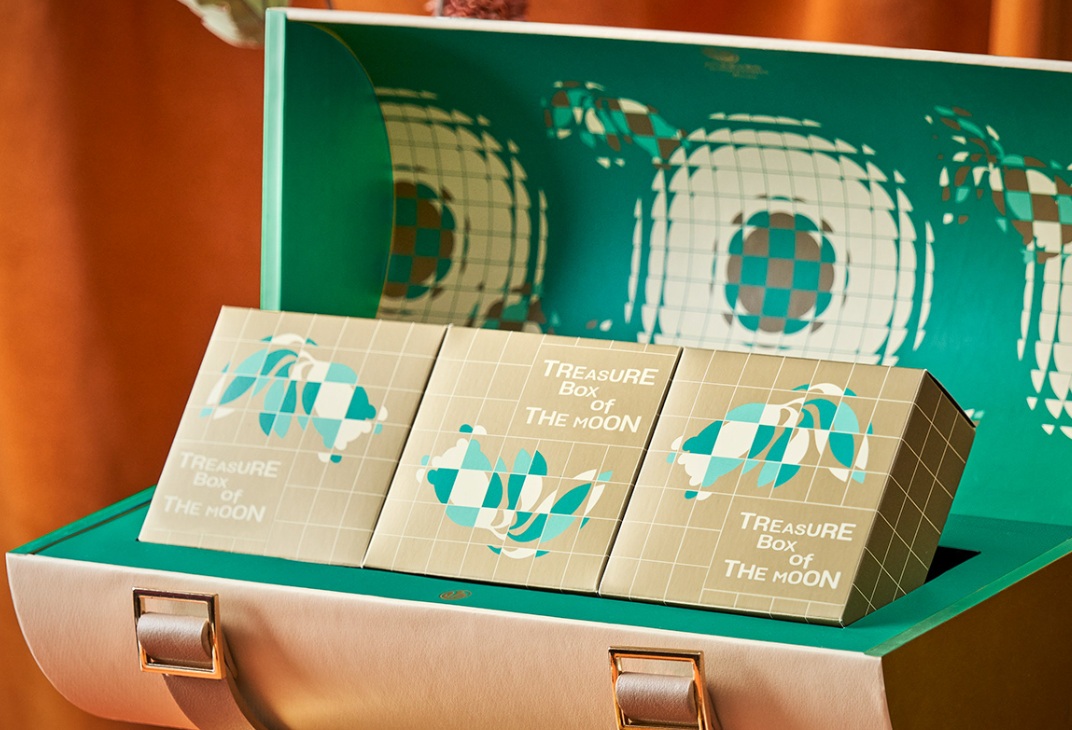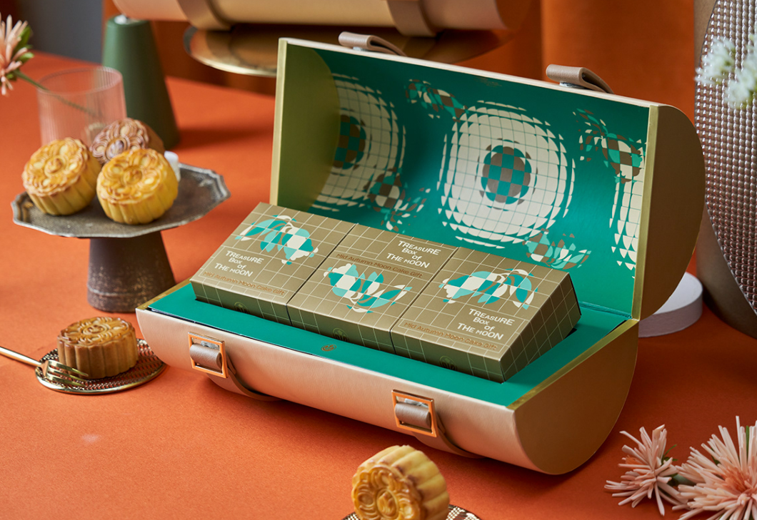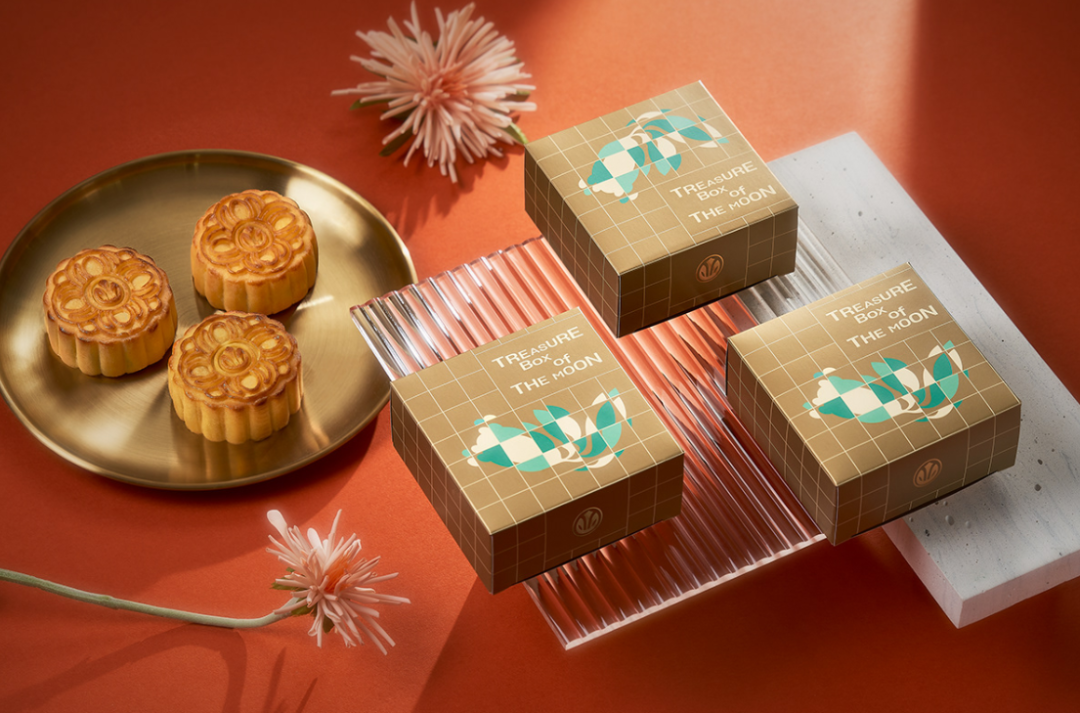 这个设计是对招牌餐厅The 8的标志性金鱼的现代改编。每个设计优雅的礼盒都以波纹效果和鲜艳的彩色图案展示了金鱼的优雅运动. 设计营造出鱼游向圆形金鱼缸的错觉,呼应中秋的月亮。