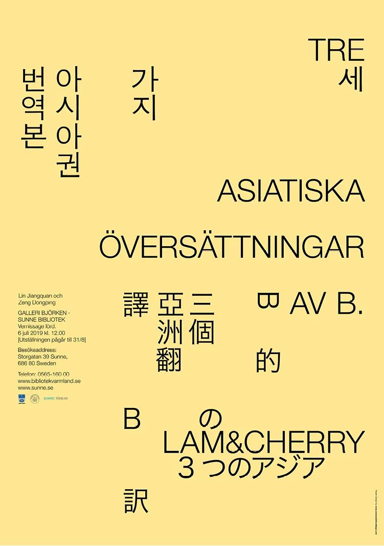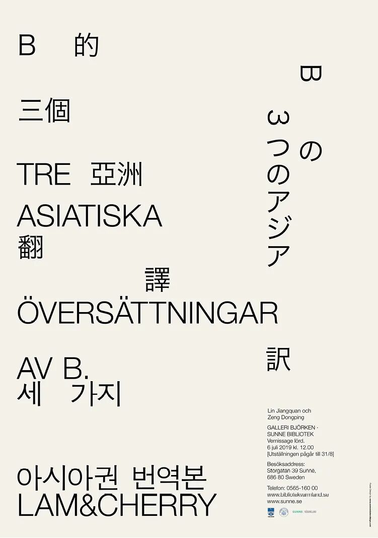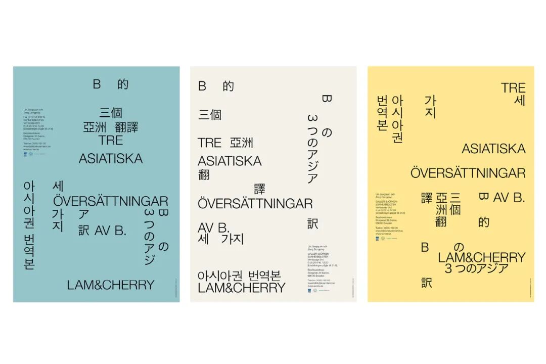这个项目是为LAM&CHERRY在瑞典的双个展《三个亚洲翻译文本》所设计的海报。艺术家通过用亚洲三种语言的文字重构形式翻译瑞典作家"B"的文学作品,作品以多种拼贴构成的手法展现。故此,我思考的是,试图在一个画面上让四国语言文字的差异性消磨掉,把字体的字重字号的大小设计的高度统一,然后重新解构编排让文字之间的界限不那么清晰,而形成了一套完整的视觉“语言”。但由于各国人民对自身母语的亲切熟悉感,第一时间也会从这套统一设计的文字中读到文本信息。