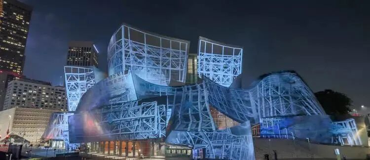 在这个夜晚,盖里标志性的金属板材建筑表皮变得不再显眼,而艺术家通过新技术将这个建筑外观的各种可能性呈现在观众面前。