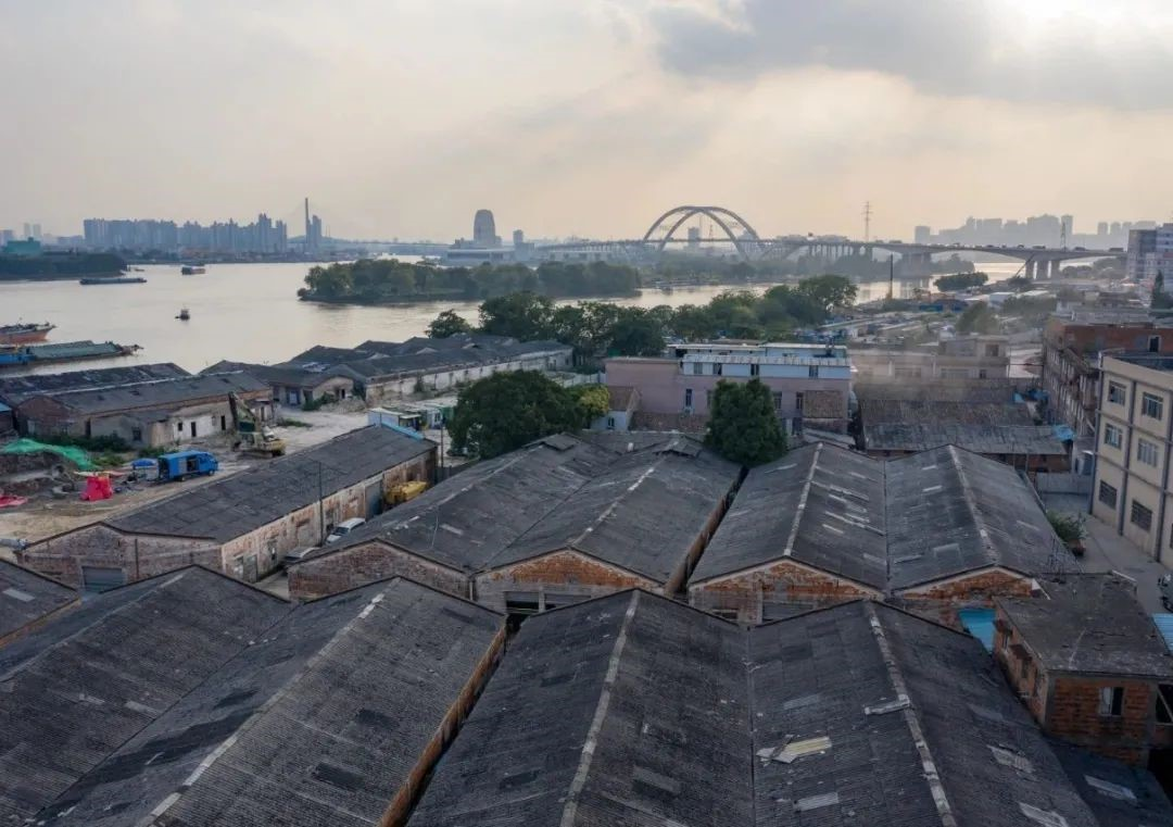 项目位于广州珠海区大干围,紧邻江边,周边曾聚集了包括广州造纸厂在内的大量旧工业厂区,工业厂区的基底风貌现仍清晰可见。