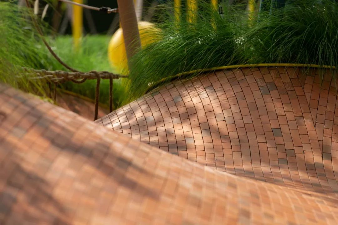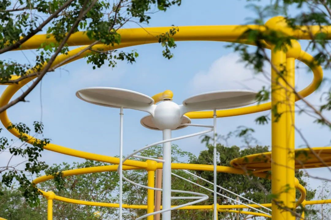 海宝转呀转,又沿着管道,穿过野趣的爬网地带,攀爬网两侧黄白相间的风车捕捉到江风,变成“风球”。