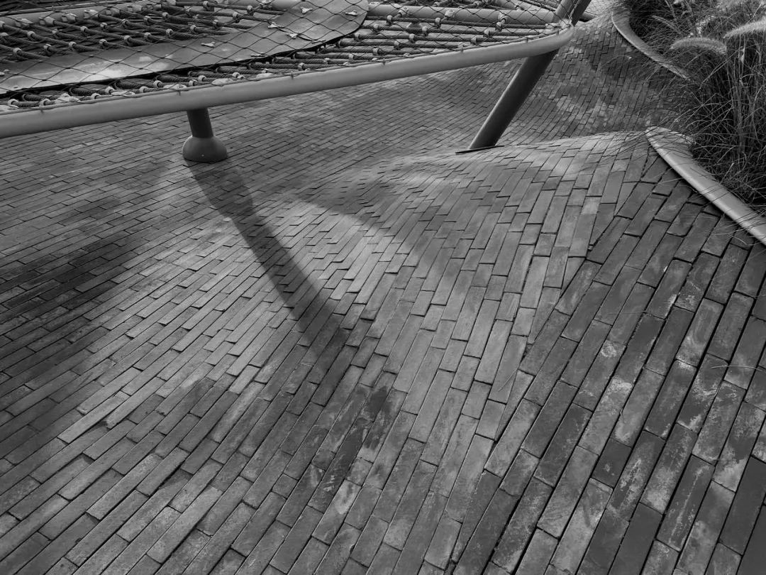 随后,设计团队改进了铺装工艺,根据坡度区间将场地划分为3 种区域, 对应不同的铺贴大样:平面段—长砖错缝铺;坡面平缓段—长短砖错缝铺;陡坡段及坡顶段—短砖错缝铺。