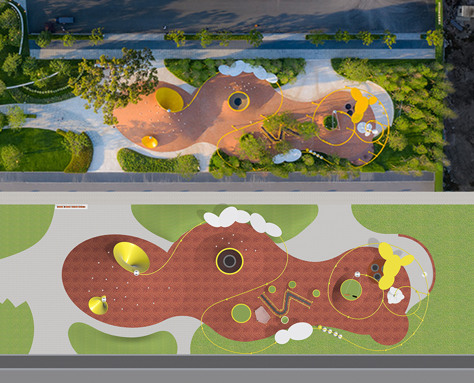 地景式的游乐空间彻底摆脱了玩法限制,它可以是起伏的山丘,可以是汹涌的海浪,也可以是对战的掩体;大喇叭形成的隧道空间,可以是安全屋、秘密基地、爱丽丝的兔子洞。对空间的想象不同,孩子们就可以构思出各种各样的故事脚本,丰富的游戏剧目会在此处不间断地上演。