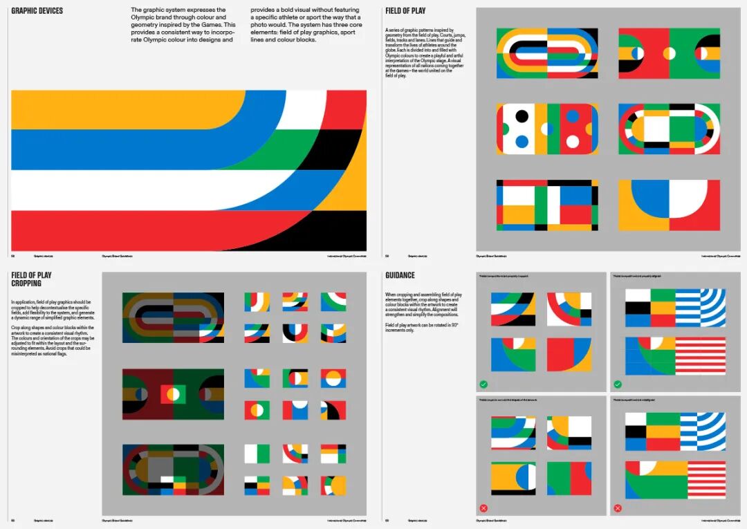 此外,还有大量通过颜色和几何图形表达奥林匹克品牌的图形元素。“这些图案的灵感来自运动场的设计——球场、跳跃、场地、跑道和车道——这些线条引导和改变了全球运动员的生活。
