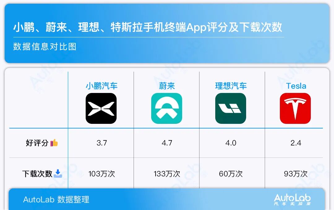 光是观察几家比较火的新势力车型在应用商店中的评分表现就已可见一斑: