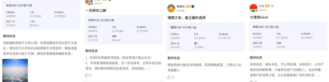 理想耿直地将“期待改进”放在了标签的前三位,而且点开之后,发现理想对这一栏并不是走过场,它不遮掩的放出了所有用户的负面评价,可以清晰看到各个车主对于理想的真实吐槽。从某种意义上来说,不堵住车主的嘴,何尝不是一种对于自己产品的自信。