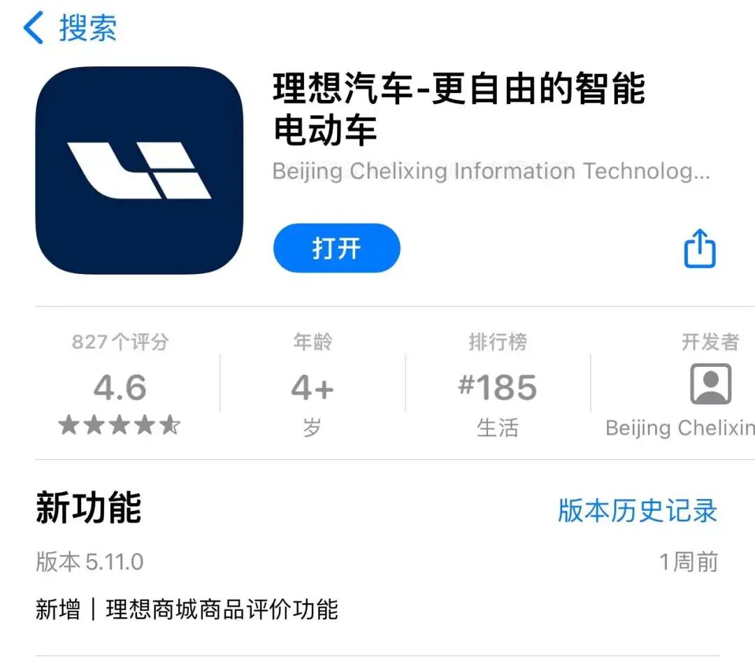 理想的APP在应用商店里拥有800多个评论和4.6的评分,在车企里都算得上中上,值得注意的是,我翻看了一下理想APP的版本历史记录,理想APP的更新频率大概在一个月2-3次,每次都有新增功能,比如商城新增“商品评价功能”、上门取车新增“服务商滴滴代驾”、商城新增“搜索功能”、主页新增“安装类商品自主预约功能”等等。