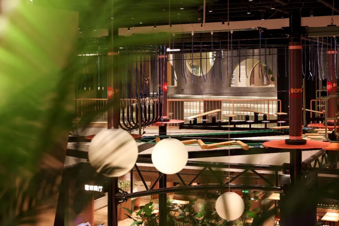 Eason介绍,弹力猩球店内复现了太阳宫的中庭结构,不仅作为其视觉中心,形成了有张力、有互动感的空间氛围;也作为其功能中心,承载了最受欢迎的攀岩、梅花桩、高空拓展、弯道旱雪等大型项目。此外,店内的设计还融入了许多绿植及自然意象的符号,将商场的中庭景观与店内的中庭景观联系起来,延续了太阳宫的室内自然之感。
