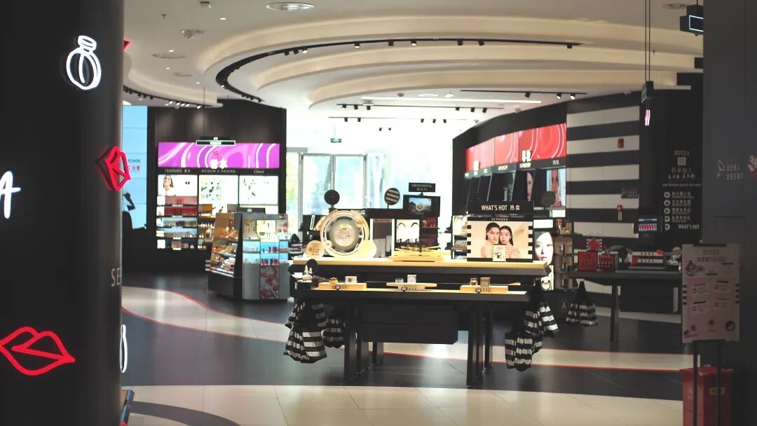 她所在丝芙兰门店位于太阳宫一层的主入口处,是丝芙兰在上海单层面积最大的门店之一,与太阳宫同期开业。店里巨大的曲面落地玻璃以及室内诸多的曲线造型,都和太阳宫的建筑形象相呼应,Vicky介绍说,这也是丝芙兰专门为太阳宫设计的一家门店。