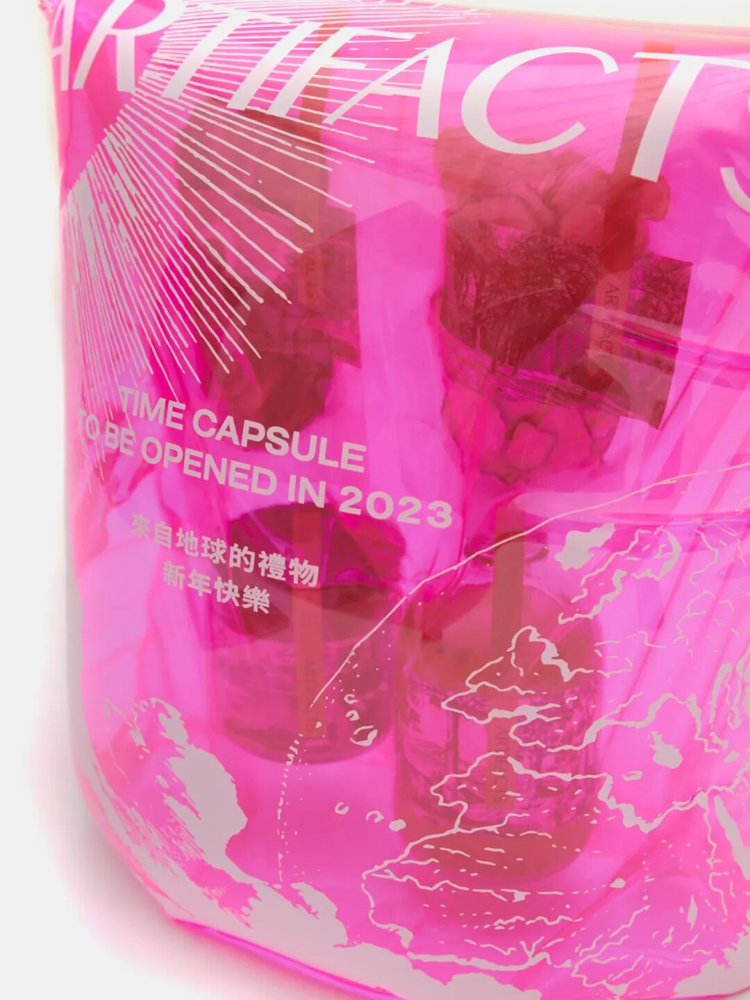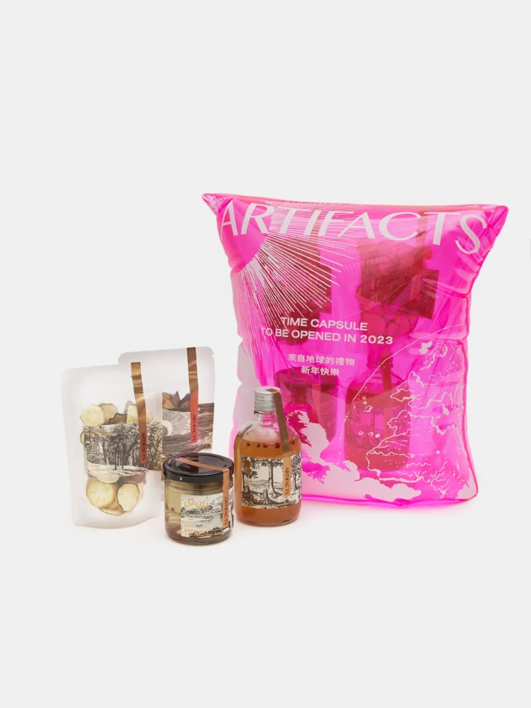 依照原料的属性赋予了四种不同意义:丰饶大地(胭脂)、潺湲河流(LOUU)、苍翠森林与灿烂千阳(SENSE CLUB)。并利用了 MUSEO.APP 网站内不同博物馆中可商用的古典画作化为瓶身的标签;外包装则是以 ARTIFACTS 喜爱的科技元素制作充气式包装,不但有种太空版的时间胶囊氛围,亦可以重複使用,让这份年节贺礼更有意义。优雅且经典的商品标籤与粉红色的科幻充气包装形成时间上的对比,这个 TIME CAPSULE 新年贺礼从裡到外也更紧扣“保存时间”的概念。只要打开并捏住洩气阀就可以洩气将物品取出,并可以放入其他珍藏的物品再次充气使用,邀请您一同制作一份属于您自己的时间胶囊。