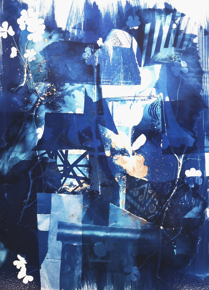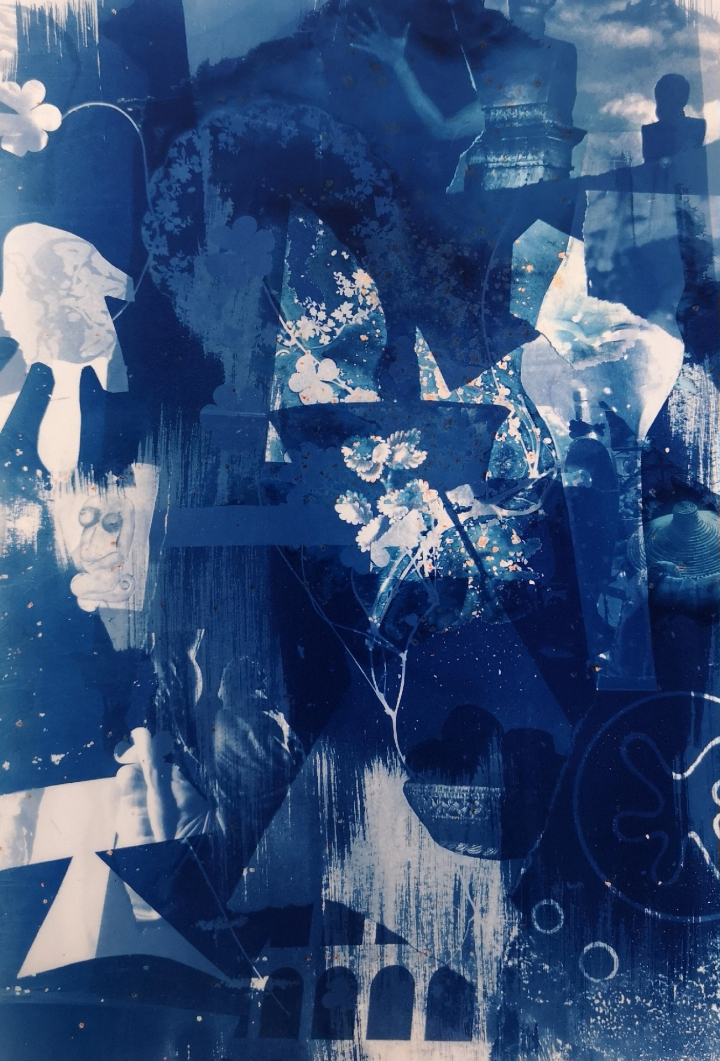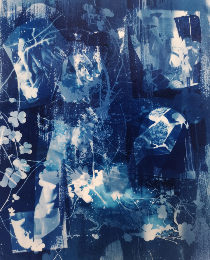 Of great significance during the creation of the arts is the cyanotype, a skill that enables me to break through the expression of photography language and renders me cognizant of the importance of modernism. Elements – flat hard edge, free combination in space, and multi-level exposure – endow the picture with mesmerizing layers, as if time is condensed in this color layer, and the tenacity and fragility of vitality are closely interwoven in the mysterious and variegated Prussian blue. One of the most important achievements in the history of modern visual art is the return and establishment of flatness at the end of the 19th century. Another point is the use of images, which are the most widely used expression technique in postmodern art. The use of images, a kind of deconstruction to some extent, is a generalization of image consumption. With Derrida applying Saussure's semiotics to semantics, the signifier and the signified are not as distinct as the rationalized thinking of modernity expects. The language sign transcends the experience world; however, it is not linked to the underworld as we wish but loiters there. Our well-anticipated certainties are more blurred in our constant efforts than transparent, thereby forming a vague and phantom-like ambiance.