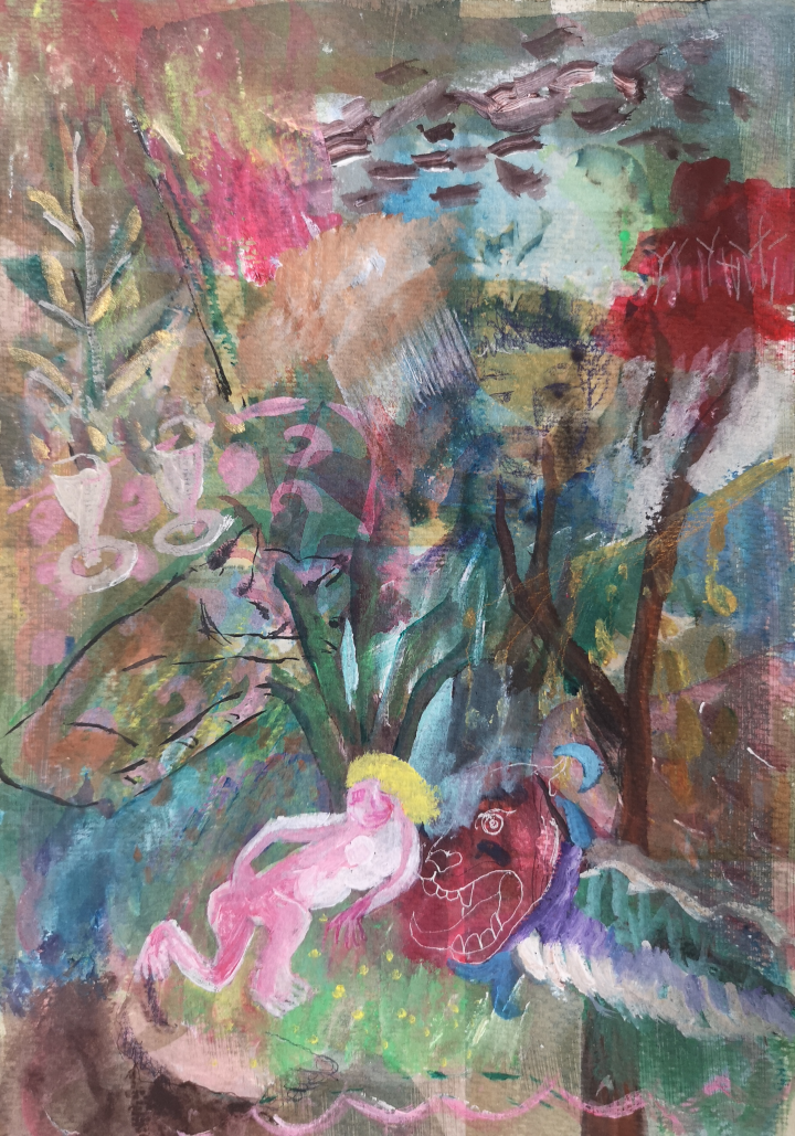 这个系列在蓝晒的基础上进行书写性的绘画,绘画的过程像是在写日记,既想去与大家分享,又有所保留,所以在书写过程中会用模糊的文字和图像进行记录,一些动物和神灵隐约出现在画面里,那是对自身记忆的一种寓言式的呈现,混论破坏了秩序,我将想象中的空间,心理引力和文化原型重组,通过这种方式将内在状态呈现出来。