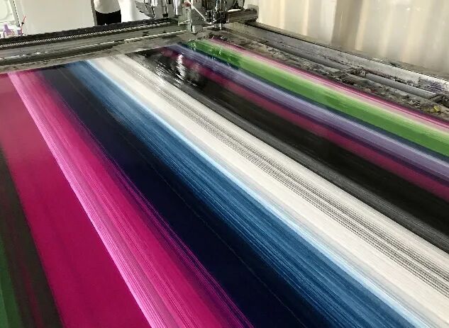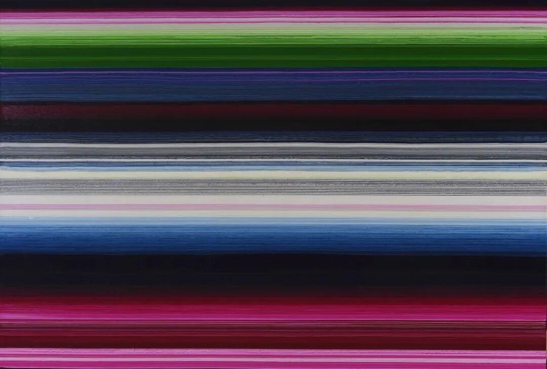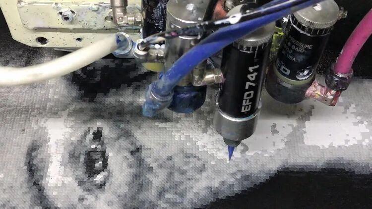 机器喷嘴阀点出的色点微微凸起,圆润光滑,如同阳光闪烁的光斑,可以画出具象或者抽象的画作,有图没有图都能作画。机器画出的线条也是浑厚笔直或曲线柔美,充满张力,可以很大程度突出颜料自身的特性,比如丙烯颜料快干和浑厚饱满,油彩色的慢干和相互融合等。