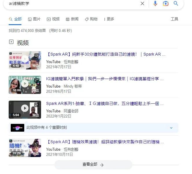 除了“如何做出爆款视频”的付费教程之外,AR滤镜的教程也是知识付费的一种模式。光是搜索“AR滤镜教程”,谷歌的结果大约有47万条,其中有专门免费教学的博主,也有相关的付费课程。