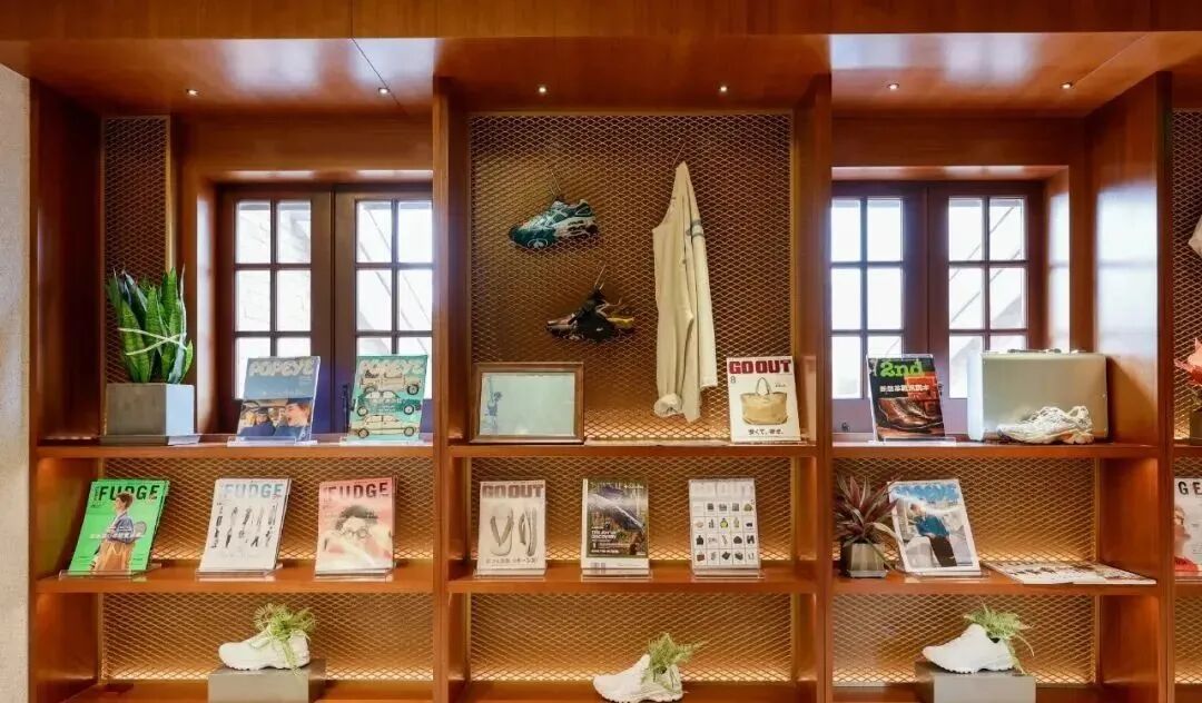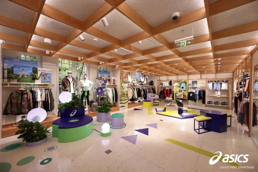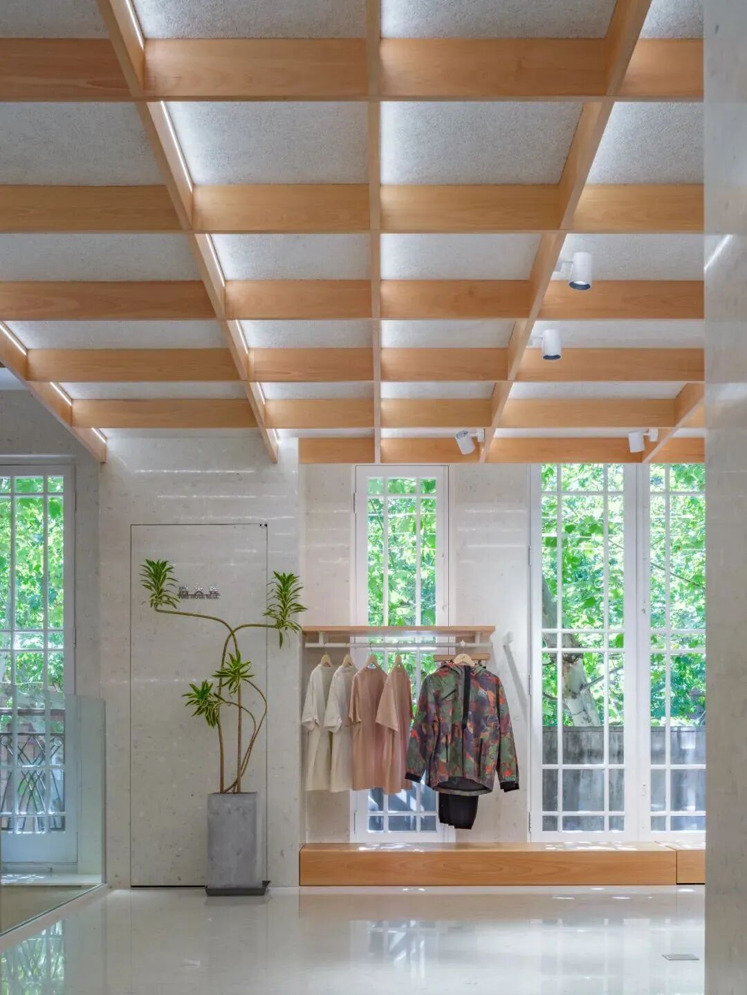 二楼是与生活方式相匹配的服装楼层,所以我们的目标是一个相对平静的空间。天花采用木丝水泥板和木纹铝材制成的格子天花,在天花附近安装线条灯,营造运动品牌活力又时尚的形象。半层区域是一个活动空间,每个季节都有不同的主题,并通过带有玻璃架子的透明固定装置与销售区域隔开。