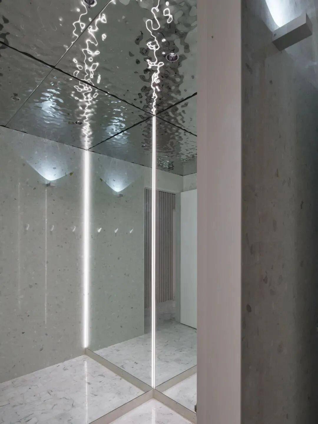 一楼以鞋子展示为主。意识到以科技为后盾的产品适合的工业空间,我们采用了水磨石、木丝水泥板、镜面不锈钢、木纹印花铝百叶等工业产品,并在墙上安装了LED显示屏。鞋柜部分由木丝水泥板制成的半圆形墙壁覆盖,产品展示在发光的亚克力板上。发光的亚克力面板在镜面不锈钢制成的天花板上重复出现,营造出未来感的销售区。后面有一个试衣间,压纹不锈钢被蓝白色的灯光照亮,让人有一种置身于大海中的神秘体验。