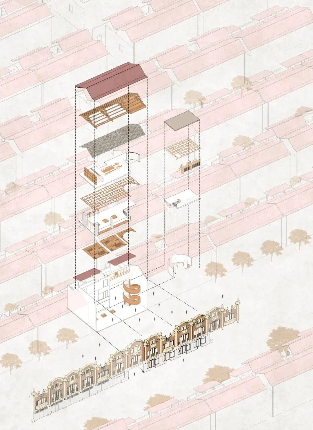 现存建筑为三层,内部二次分隔,结构复杂,前后高低不一。我们专注于如何吸引大众至商铺和楼上的休闲空间,我们拆除了所有分隔前后的墙壁,做成大的敞开空间以便可以四处活动。