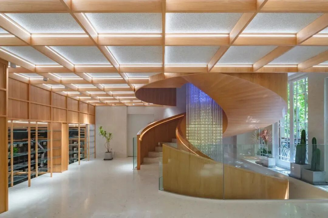 三楼是利用现有建筑结构的VIP活动体验空间。与一楼和二楼不同,该空间结合了胡桃木和黄铜,营造出平静的氛围。黄铜色的金属格栅被拉伸在天花板上、螺旋楼梯周围、显示器的背板上等,灯光给人一种柔和、奢华的感觉。这是一种怀旧的空间,与西班牙巴洛克风格的外观相协调。