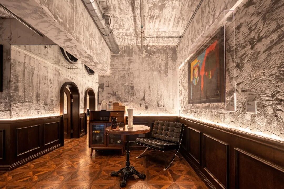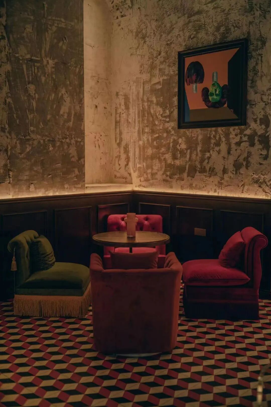 空间设计、灯光氛围,以及所有软装搭配自然是由周周亲自操刀,她的设计灵感来源于美国禁酒令时期的地下酒吧,为了营造出如洞穴一般的体验感,她牺牲部分空间做了弧形墙面,并涂上了质感粗糙的水泥,使得空间整体呈现出隐秘又热烈的氛围。